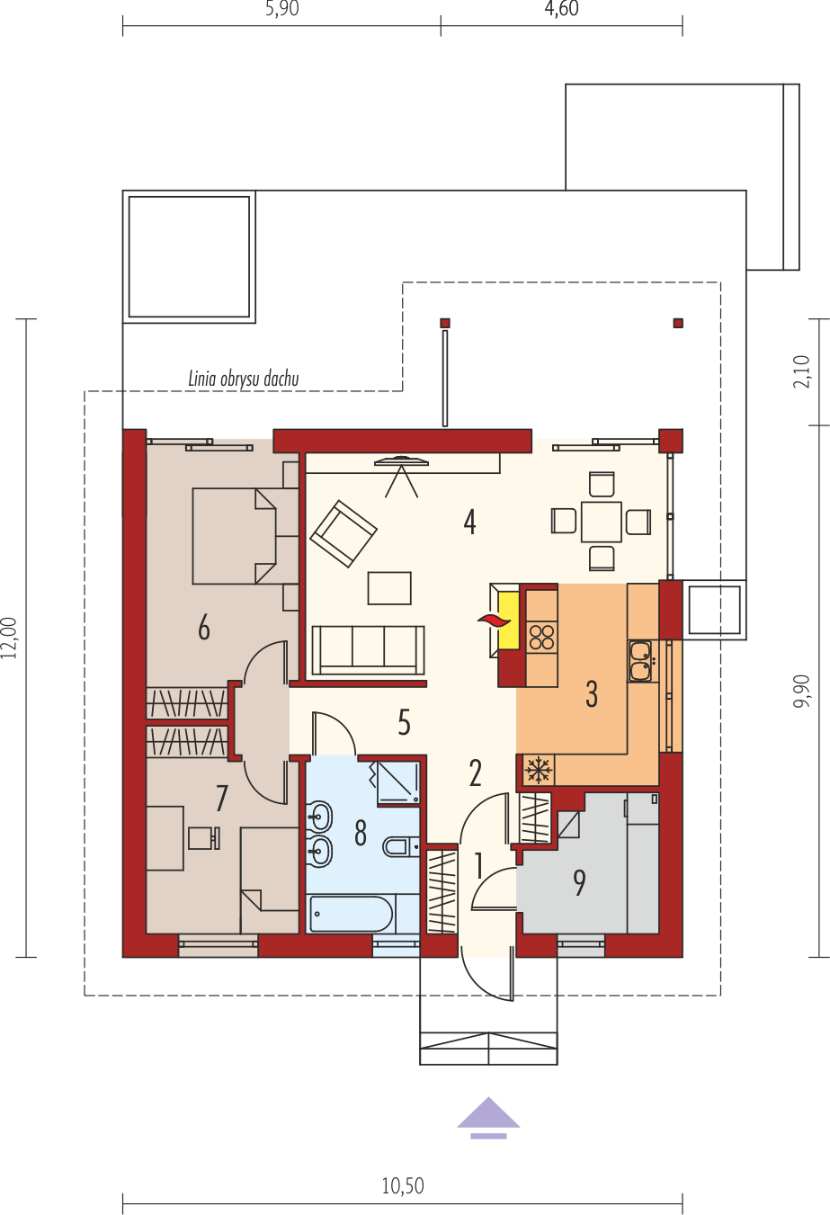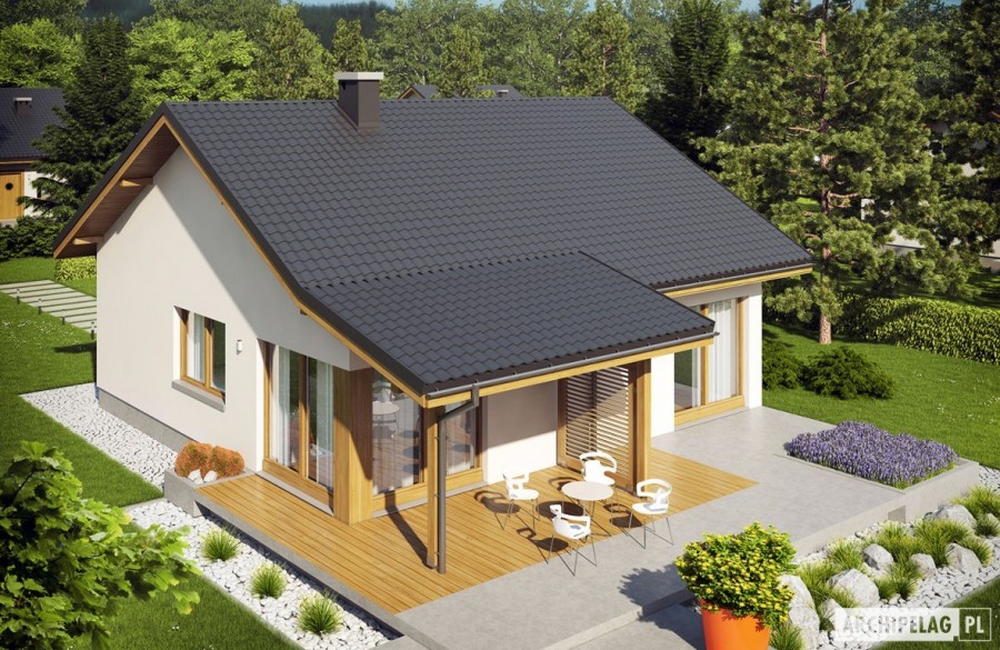 W projekcie zastosowano systemy zabudowy ścian działowych i sufitów podwieszanych Rigips. Więźba dachowa w systemie dachu prefabrykowanego w systemie płytki kolczastej MITEK.Charakterystyka: Dom parterowy, niepodpiwniczonyPrzeznaczenie: Dom dla 2-3-osobowej rodzinyTechnologia i konstrukcja:Fundamenty: ławy, bloczki keramzytowe 24 cm, ocieplenie styropian 15 cmŚciany zewnętrzne: murowane, dwuwarstwowe, keramzyt 24 cm, ocieplenie 20 cmŚciany wewnętrzne: ścianki działowe w systemie suchej zabudowy Rigips 12 cmPodłoga na gruncie: płyta betonowa, ocieplenie styropian 15 cmStrop: pas dolny wiązara stanowi konstrukcję, sufit podwieszony RigipsDach: wiązary drewniane prefabrykowane, dachówka płaska Bergamo firmy Röben, docieplenie wełna mineralna 30 cmRozwiązania instalacyjne: Ogrzewanie: kocioł gazowy, rozprowadzenie ciepła: grzejniki Wentylacja: grawitacyjna Wykończenie:Elewacja: tynk cienkowarstwowy mineralnyStolarka: drewniana, PCV lub aluminiowa, rolety zewnętrzne w systemie CleverBox firmy BeCleverWersje - zapytaj o dostępność:- Elmo V ENERGO - z garażem jedno- lub dwustanowiskowym- Elmo III ENERGO – taki sam układ funkcjonalny, ściany nośne i działowe murowane, tradycyjna więźba dachowa, różne wersje garaży- Elmo ENERGO - ściany nośne i działowe murowane, tradycyjna więźba dachowa, inne wykończenie elewacji, różne wersje garaży- Elmo II ENERGO - ściany nośne i działowe murowane, tradycyjna więźba dachowa, podobny układ funkcjonalny, inne wykończenie elewacji, różne wersje garaży- Elmo IV ENERGO - ściany nośne i działowe murowane, tradycyjna więźba dachowa, inne wykończenie elewacji, rożne wersje garażyIstnieje techniczna możliwość:- zbliźniaczenia lub wykonania domu dwulokalowego- wykonania domu w technologii szkieletowej- podpiwniczeniaAtuty projektu okiem architekta:- Zwarta klasyczna bryła budynku sprzyjająca energooszczędności, minimalizująca ryzyko wystąpienia mostków termicznych- Szybkie w montażu prefabrykowane elementy dachu z gwarancją jakości, stanowiące jednocześnie konstrukcję stropu, eliminują konieczność stawiania ścian nośnych, fundamentów pod nimi oraz budowy stropu gęstożebrowego- Ścianki wewnętrzne w technologii lekkiej umożliwiają dowolną aranżację wnętrza- Kompaktowe i ergonomiczne wnętrze z wydzielonymi strefami: dzienną i nocną- Wygodna, duża, przechodnia kuchnia skomunikowana z jadalnią- Funkcjonalna szafa wnękowa w przedpokoju- Duże przeszklenia w jadalni z widokiem na zieleń ogrodu- Zadaszony, przytulny taras- Duże pomieszczenie kotłowni pozwala na zastosowanie dowolnego źródła ogrzewania