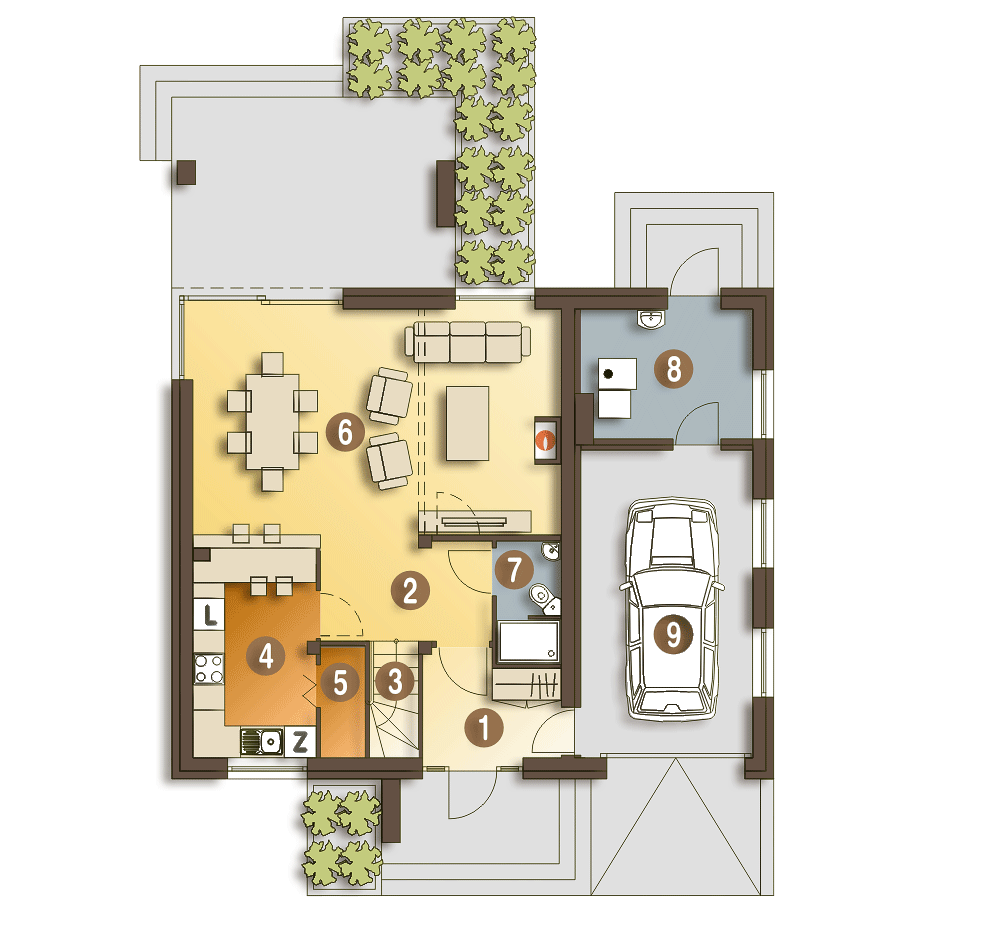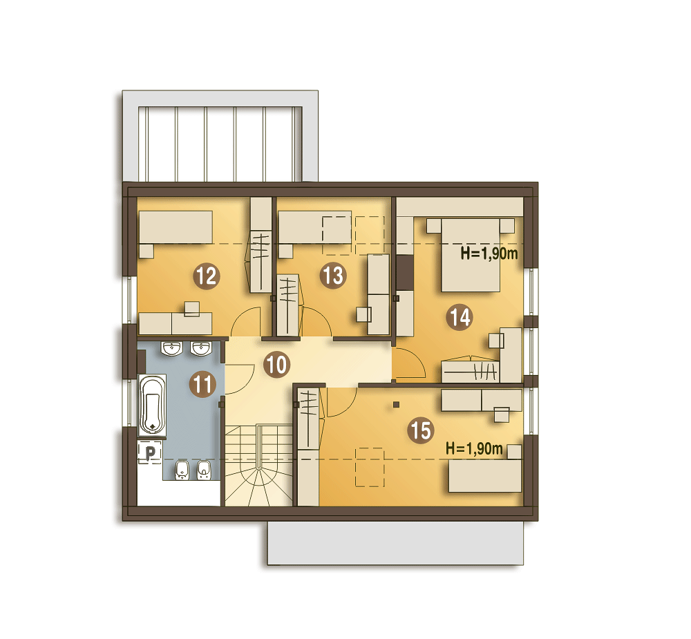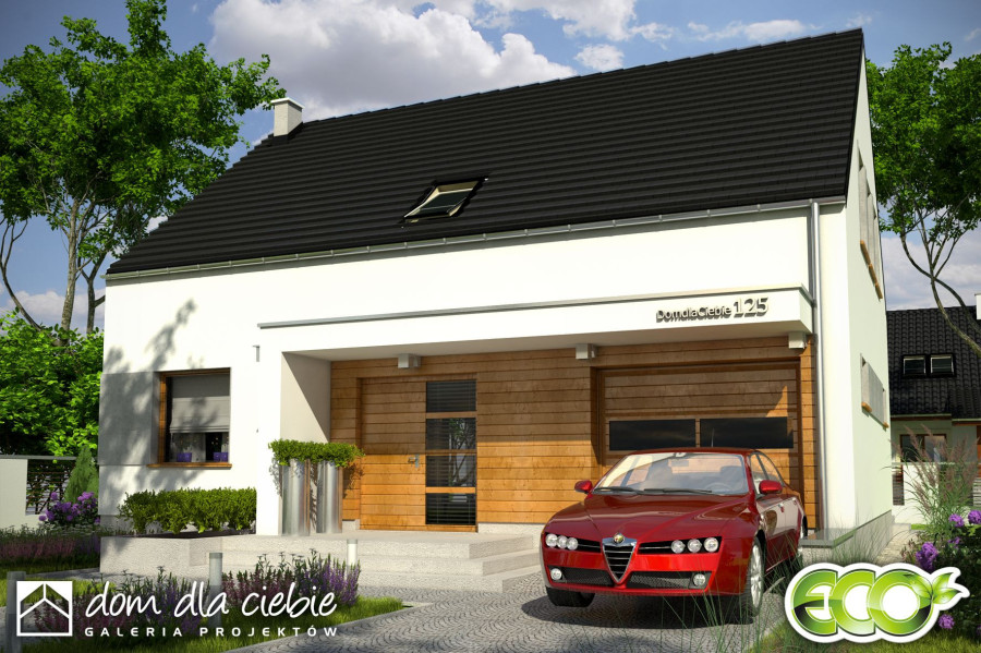 Emma trend to nowoczesna wersja projektu Emma. Ekonomiczny, niewielki dom jednorodzinny z poddaszem użytkowym dla 4-5 osobowej rodziny. Parter stanowią (oprócz wiatrołapu i łazienki): wygodna kuchnia ze spiżarnią (zlokalizowaną pod wyższym biegiem schodów) oraz duży salon, z którego wychodzi się na obszerny taras. Garaż dostępny jest z wiatrołapu a za garażem znajduje się ustawna kotłownia, która z powodzeniem pomieści piec C.O. na paliwo stałe. Do kotłowni prowadzi również wejście z ogrodu, co ułatwi dostarczanie opału. Poddasze składa się z aż czterech sypialni oraz obszernej łazienki, w której wydzielono ustronne miejsce na pralnię. Dom posiada współczesny, świeży wygląd oraz przemyślaną bryłę i prostą konstrukcję.fundamenty: BETONOWE ściany zewnętrzne: PUSTAK CERAM. POROTHERM+STYROPIAN TERMO ORGANIKA ściany wewnętrzne: POROTHERM, GK rodzaj stropu: TERIVA elewacje: TYNK STRUKTURALNY, OKŁ.KLINKIEROWA pokrycie dachu: DACHÓWKA CEM. lub CER.