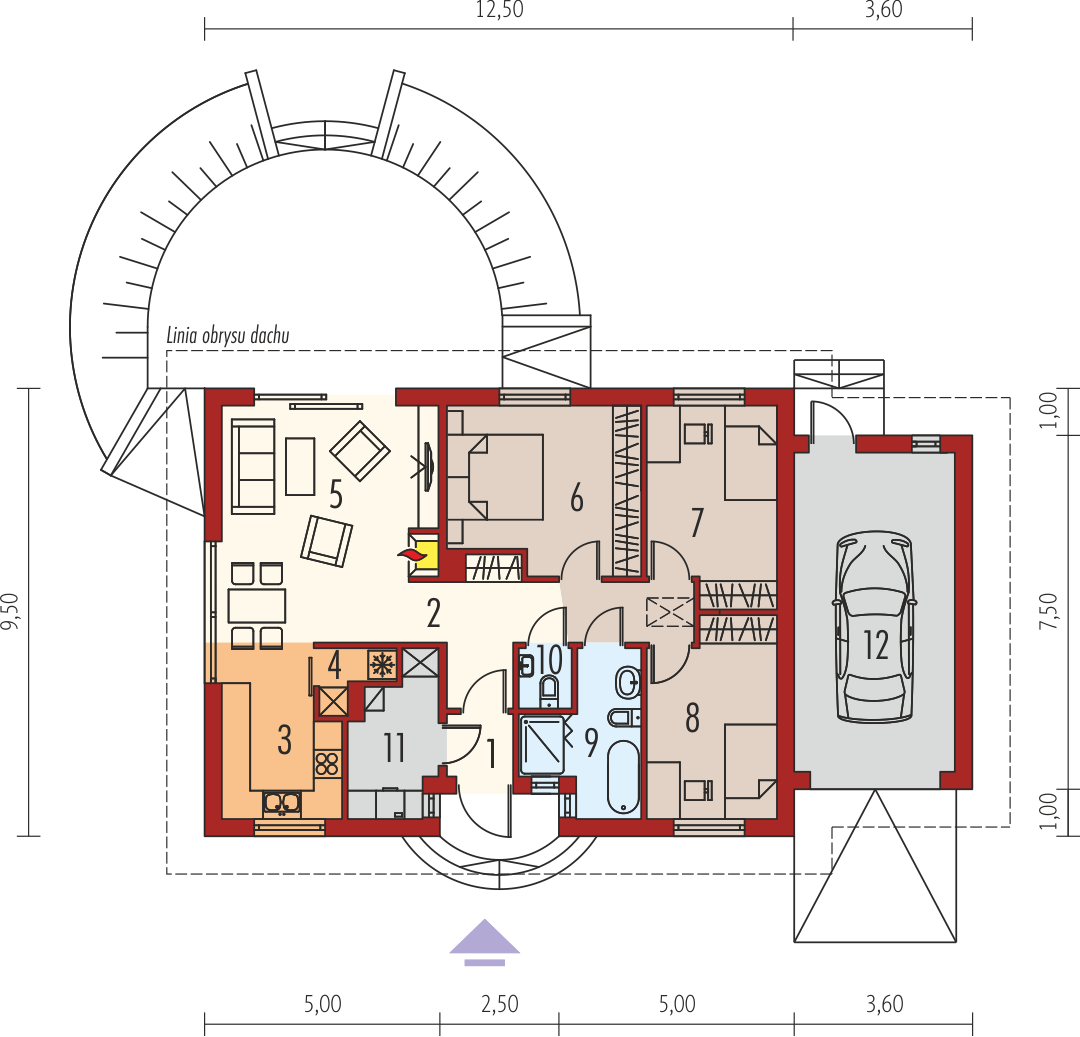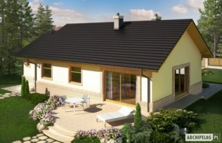 Charakterystyka: Dom parterowy, niepodpiwniczony, z garażem jednostanowiskowym Przeznaczenie: Dom dla 3-4 osobowej rodziny Technologia i konstrukcja: Ściany zewnętrzne: murowane Strop: gęstożebrowy Dach: konstrukcja drewniana, dachówka płaska lub inna o podobnych parametrach. Więźba dachowa dostępna również w systemie prefabrykacji drewnianej.Rozwiązania instalacyjne: Ogrzewanie: kocioł gazowy, rozprowadzenie ciepła: grzejniki Wentylacja: grawitacyjna Wykończenie: Elewacje: tynk mineralny w kolorze TO-YE028 z palety firmy Termo Organika, okładzina klinkierowa, cokół klinkierowy Stolarka: drewniana lub PCV, drzwi wejściowe i brama garażowa firmy HörmannWersje w serii Erin - zapytaj: - Erin – wersja podstawowa - Erin II – dom bez wykusza w jadalni - Erin II reco – energooszczędne instalacje firmy Vaillant: pompa ciepła, wentylacja mechaniczna z rekuperacją, system fotowoltaiczny oraz ogrzewanie podłogowe firmy Purmo - Erin III – dom bez wykusza w jadalni, podobny układ funkcjonalny – przejście z domu do garażu - Erin IV (wiązary) – dom bez wykusza w jadalni, system suchej zabudowy ścian działowych Rigips, wiązary prefabrykowane - system płytki kolczastej Mitek - wszystkie wersje o podobnym układzie funkcji i takim samym wykończeniu elewacji - wszystkie wersje z trzema wariantami garaży: bez garażu, z garażem jedno- i dwustanowiskowym - odbicie lustrzane do każdej wersjiWszystkie wersje domów możliwe w dwóch standardach/wariantach instalacyjnych: - ENERGO: kocioł gazowy kondensacyjny, grzejniki, wentylacja grawitacyjna, OZE: kolektory słoneczne - ENERGO PLUS: pompa ciepła, ogrzewanie podłogowe, wentylacja mechaniczna, OZE: panele fotowoltaiczne Istnieją techniczne możliwości wykonania zmian: - podpiwniczenia budynku - wykonania budynku w technologii szkieletowej - dokonania zmian funkcjonalnych wg indywidualnych wymagań