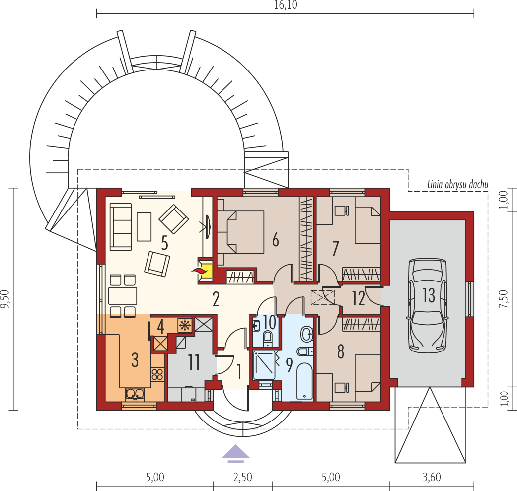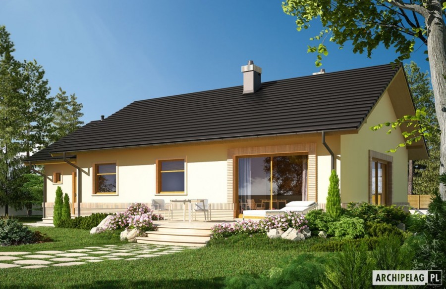 Charakterystyka: Dom parterowy, niepodpiwniczony, z garażem jednostanowiskowym Przeznaczenie: Dom dla 3-4 osobowej rodziny Technologia i konstrukcja: Ściany zewnętrzne: murowane, jednowarstwowe, beton komórkowy typ Energo Ultra+ firmy Ytong 36,5 cmŚciany wewnętrzne: nośne i działowe murowane, cegła wapienno-piaskowa 18 cm i 12 cm Strop: gęstożebrowy Teriva, ocieplenie wełna mineralna firmy Isover 30 cm Dach: konstrukcja drewniana, dachówka płaska typu Bergamo firmy Röben. Więźba dachowa dostępna również w systemie prefabrykacji drewnianej.Rozwiązania instalacyjne: Ogrzewanie: kocioł gazowy kondensacyjny firmy Viessmann, rozprowadzenie ciepła: grzejniki firmy Purmo Wentylacja: grawitacyjna OZE: kolektory słoneczne firmy Viessmann Dodatkowo: stacja uzdatniania wody firmy ViessmannWykończenie: Elewacje: tynk mineralny cienkowarstwowy i okładzina klinkierowa, cokół klinkierowy Stolarka: drewniana lub PCV, drzwi wejściowe i brama garażowa firmy HörmannWersje w serii Erin - zapytaj o dostępność: - Erin – wersja podstawowa - Erin II – dom bez wykusza w jadalni - Erin II reco – energooszczędne instalacje firmy Vaillant: pompa ciepła, wentylacja mechaniczna z rekuperacją, system fotowoltaiczny oraz ogrzewanie podłogowe firmy Purmo - Erin III – dom bez wykusza w jadalni, podobny układ funkcjonalny – przejście z domu do garażu - Erin IV (wiązary) – dom bez wykusza w jadalni, system suchej zabudowy ścian działowych Rigips, wiązary prefabrykowane - system płytki kolczastej Mitek - wszystkie wersje o podobnym układzie funkcji i takim samym wykończeniu elewacji - wszystkie wersje z trzema wariantami garaży: bez garażu, z garażem jedno- i dwustanowiskowym - odbicie lustrzane do każdej wersjiWszystkie wersje domów możliwe w dwóch standardach/wariantach instalacyjnych: - ENERGO: kocioł gazowy kondensacyjny, grzejniki, wentylacja grawitacyjna, OZE: kolektory słoneczne - ENERGO PLUS: pompa ciepła, ogrzewanie podłogowe, wentylacja mechaniczna, OZE: panele fotowoltaiczne Istnieją techniczne możliwości wykonania zmian: - podpiwniczenia budynku - wykonania budynku w technologii szkieletowej - dokonania zmian funkcjonalnych wg indywidualnych wymagań