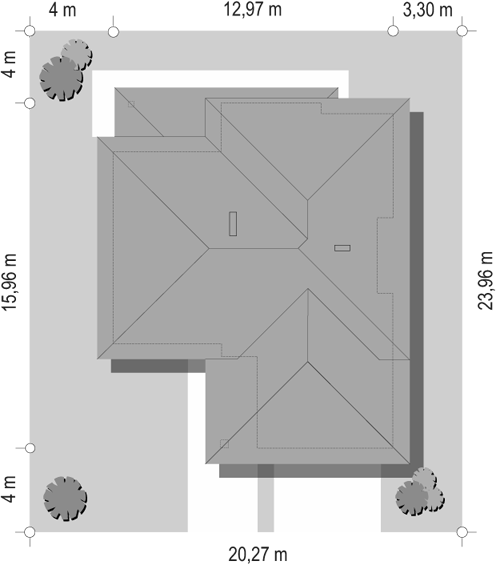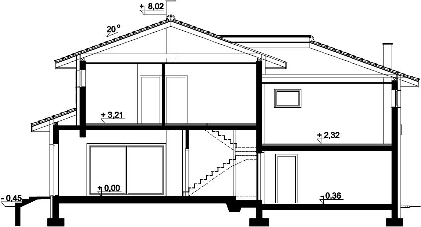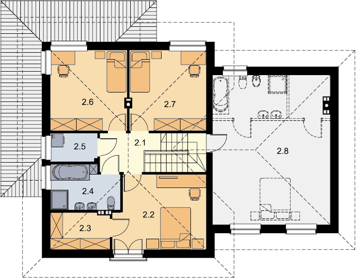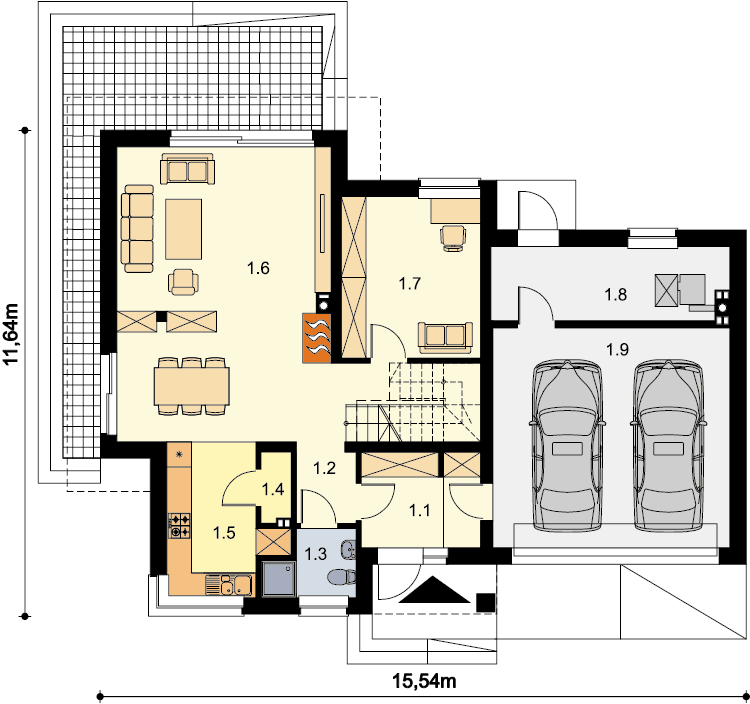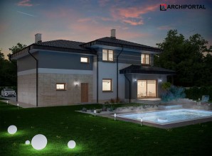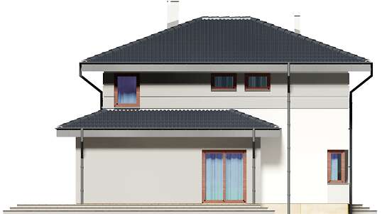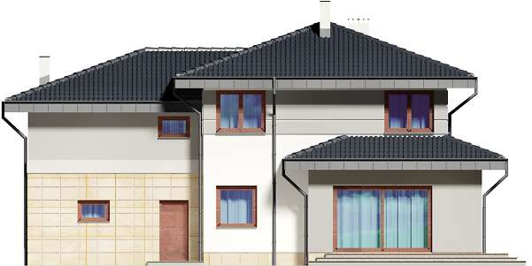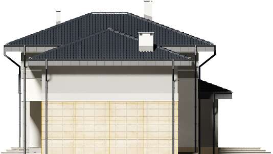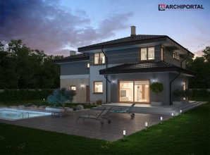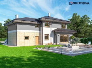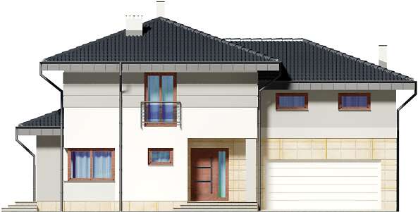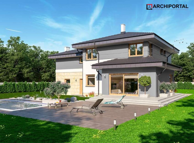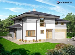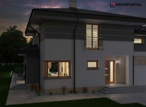 Przestronny, wygodny i funkcjonalny dom piętrowy o nowoczesnej bryle, idealny dla 4-5 osobowej rodziny. Do wnętrza dostajemy się przez duży wiatrołap, zlokalizowany w gustownym podcieniu. Nie zapomniano tutaj o miejscu na ciąg praktycznych szaf przesuwnych. Salon połączono z jadalnią, na uwagę zasługują duże przeszklenia, dzięki którym wnętrze jest doskonale oświetlone o każdej porze roku. Do ogrodu dostaniemy się zarówno przez spore drzwi balkonowe, jak również przez wyjście koło jadalni. W bezpośrednim sąsiedztwie pokoju dziennego znalazła się kuchnia, posiadająca nowoczesne okno narożne. Nie zapomniano także o praktycznej spiżarni oraz łazience. Dodatkowy pokój na parterze może pełnić rolę gabinetu lub pokoju gościnnego. Do garażu dostaniemy się bezpośrednio z wiatrołapu, Za garażem