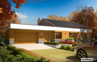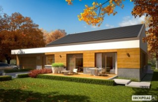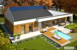 Budynek zaprojektowano jako wysokoenergooszczędny, wyposażony w pompę ciepła oraz system solarny. W projekcie przewidziano również wentylację mechaniczną z rekuperacją. Standard MULTI-COMFORT:Dom spełnia standard MULTI-COMFORT Grupy Saint-Gobain. Komfort rozumiany jako wpływ środowiska, w którym mieszkamy na nasze samopoczucie i zdrowie. Dom realizuje tę ideę za pomocą właściwego połączenia wszystkich elementów funkcjonujących w budynku – odpowiedniego oświetlenia, właściwej wentylacji, konstrukcji ścian, dachu oraz instalacji, przy jednoczesnej trosce o środowisko naturalne. Najwyższą jakość produktów Saint-Gobain zapewniają marki: ISOVER, Rigips, Ecophon, PAM, Weber, Glass oraz Glasssolution. Charakterystyka: Dom parterowy, niepodpiwniczony, z garażem dwustanowiskowymPrzeznaczenie: Dom dla 3-5-osobowej rodzinyTechnologia i konstrukcja:Fundamenty: ławy, bloczki betonowe 24 cm, ocieplenie styropian 15 cmŚciany zewnętrzne: murowane, dwuwarstwowe, beton komórkowy 24 cm, ocieplenie 25 cmŚciany wewnętrzne: murowane, ściany nośne 24 cm, ścianki działowe 12 cmPodłoga na gruncie: płyta betonowa, ocieplenie wełna mineralna 20 cmStrop i stropodach nad garażem: strop gęstożebrowy Teriva,nad garażemstropodach odwróconyDach: konstrukcja drewniana, ocieplenie wełna mineralna 30 cm, dachówka płaska lub inna o podobnych parametrachRozwiązania instalacyjne energooszczędne:- pompa ciepła i ogrzewanie podłogowe- wentylacja mechaniczna z odzyskiem ciepła- system solarnyWykończenie:Elewacja: tynk cienkowarstwowy mineralny i okładzina drewnianaStolarka: drewniana, PCV lub aluminiowa, drzwi wejściowe i brama garażowa firmy HörmannOtoczenie: system tarasowy ProDeck - deska kompozytowa Terra w kolorze złoty dąbWersje - zapytaj o dostępność:- EX 11 G2 (w. D) – wersja standardowa- EX 11 G2 (w. D) soft – wersja standardowa, z kotłem kondensacyjnym i wentylacją grawitacyjną- EX 11 G2 (w. A, B, C) – inne rozwiązania funkcjonalne pomieszczeń dodatkowych, inna kompozycja elewacji- Odbicie lustrzane do każdej wersji Istnieje techniczna możliwość:- zmiany kąta nachylenia dachu do 30º i adaptacji poddasza na strychAtuty projektu okiem architekta:- W projekcie zastosowano rozwiązania technologiczne grupy Saint-Gobain- Zwarta energooszczędna bryła budynku, znakomite parametry cieplne- Funkcjonalne wnętrze, podzielone na strefy użytkowe- Wygodna otwarta kuchnia z wyspą oraz praktyczną spiżarnią- Przestronny salon z kominkiem oferujący wiele możliwości aranżacji- Strefa nocna z trzema sypialniami oddzielona od strefy dziennej- Pojemne szafy wnękowe- Szklana ściana oddzielająca salon od ogrodu i basenu- Częściowo zadaszony taras- Funkcjonalne zadaszenie nad wejściem do budynku- Atrakcyjna i modna elewacja- Garaż oddzielony termicznie od ogrzewanej części budynku