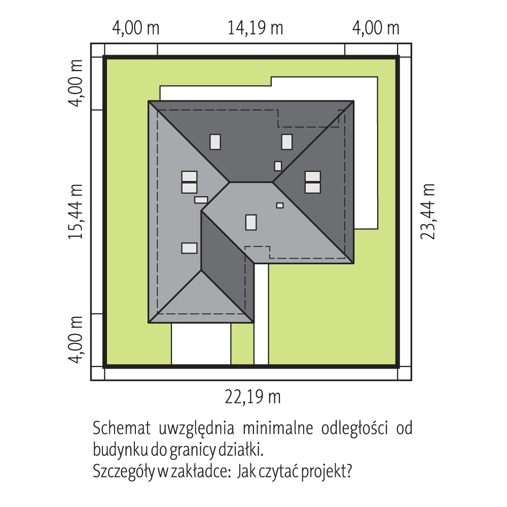 Ryzalit na rzucie ośmiokąta często wzbogaca bryłę prostych projektów domów. W Rodzinie Figi stanowi element salonu w elewacji ogrodowej. Projekt domu Figa Rex jest największy spośród kilku pokrewnych, niedużych domów parterowych z użytkowym poddaszem o prawie identycznym programie użytkowym. Jako jeden z dwóch oferuje użytkowe poddasze nad dostawionym garażem. Wszystkie wersje powstały na planie prostokąta podzielonego konstrukcyjnie na dwie połowy, a proporcje niemal kwadratowego rzutu wydłużają się lekko, równolegle do kalenicy dwuspadowego dachu i elewacji frontowej wraz ze wzrostem powierzchni wariantów. Część frontowa z kuchnią, ma charakter gospodarczy: otwarty hol rozprowadza wejścia z sieni, łazienki i kotłowni wykorzystującej miejsce pod schodami na poddasze. Sypialnię od ogrodu można włączyć do pokoju dziennego rezygnując ze ścianki działowej. Projekt domu Figa Rex ma na poddaszu cztery duże sypialnie dla pięciu osób i łazienkę. Pokoje oświetlają szerokie wyjścia na balkony w ścianach szczytowych. Poza opuszczonymi częściowo okapami dachu nad ryzalitem i wejściem do domu, stanowią one jedyne detale urozmaicające zwartą bryłę.