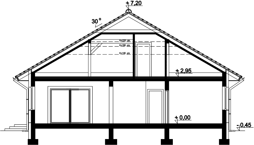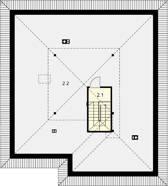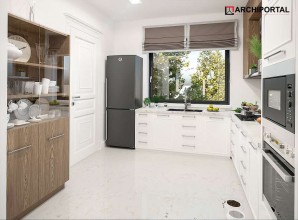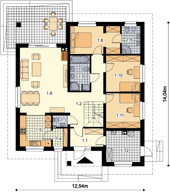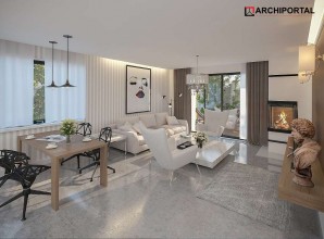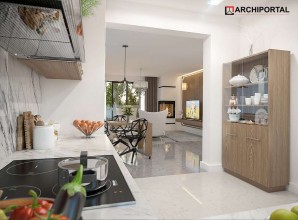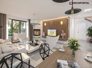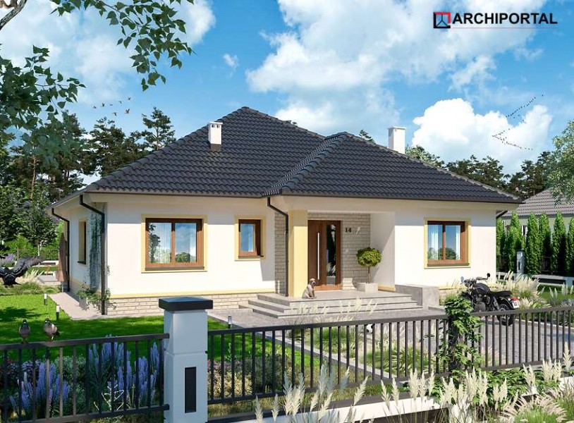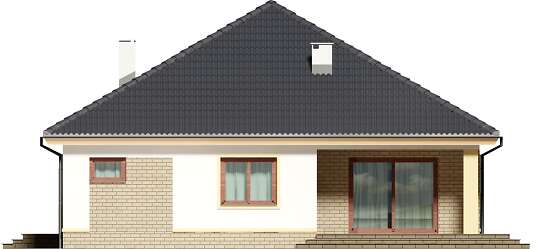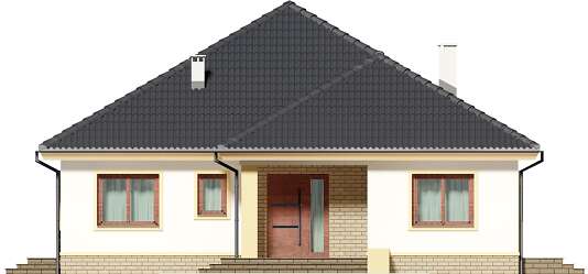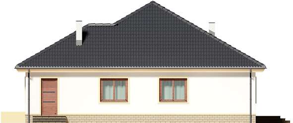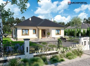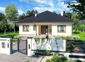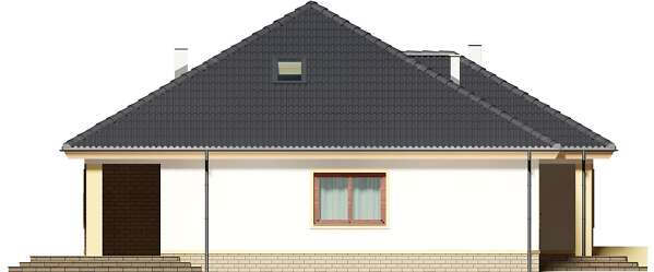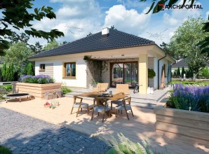 Elegancki, funkcjonalny dom parterowy, który doskonale nadaje się dla rodzin 4-5 osobowych. Jego ponadczasowa bryła dopasuje się do każdego krajobrazu, a elewacja może być wykończona zarówno w tradycyjny, jak i nowoczesny sposób. Plan budynku oparto na kwadracie, co zminimalizuje koszty budowy i późniejszej eksploatacji. Całość została zwieńczona dwoma gustownymi podcieniami, wejściowym oraz od strony ogrodu. Wnętrze domu podzielono na 3 strefy, w ciągu dnia domownicy mogą się relaksować w przestronnym, dobrze oświetlonym salonie, sąsiadującym z otwartą kuchnią, którą w razie potrzeby można zamknąć ścianką i oddzielić od pokoju dziennego. Nie zapomniano także o praktycznej spiżarni oraz toalecie. Strefa nocna to 3 ustawne pokoje i łazienka, w której bez trudu zmieści się wanna i prysznic. Główna sypialnia posiada przechodnią garderobę oraz własną, wygodną łazienkę. Strefa gospodarcza została oddzielona od reszty domu i dostaniemy się do niej bezpośrednio z wiatrołapu. W dużej kotłowni z bezpośrednim wyjściem na zewnątrz, zaprojektowano dwa rodzaje ogrzewania: GAZOWE oraz na PALIWO STAŁE. Inwestor sam zdecyduje, które z nich wykorzysta w swoim domu. Prawdziwym atutem budynku jest jednak obszerny korytarz, w którym zaprojektowano schody drewniane prowadzące na nieużytkowe poddasze. W ten sposób uzyskano dodatkową przestrzeń, którą w późniejszym czasie lub od razu będzie można zaadaptować na strych, gabinet, pokój hobby, studio lub dodatkowe pomieszczenia mieszkalne. Budynek zaprojektowano w oparciu o najnowsze przepisy prawa budowlanego, z dużą dbałością o jego wpływ na środowisko naturalne.