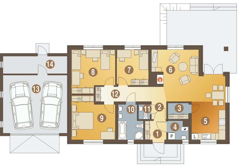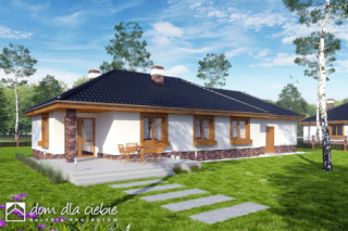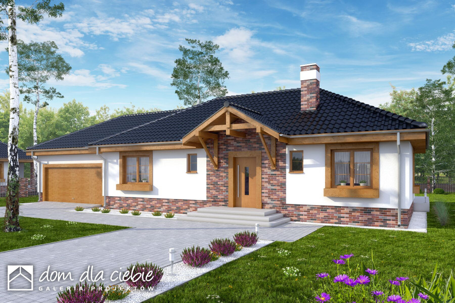 Projekt domu Filipek A1 z garażem dwustanowiskowym to wariant projektu Filipek oznaczonego jako A. Projekt w tym wariancie ma powiększony garaż na dwustanowiskowy i pomieszczenie gospodarcze za garażem. Filipek to atrakcyjna propozycja domu parterowego dla 4 osobowej rodziny, o prostej konstrukcji i współczesnej stylistyce. Dom przekryty jest wielospadowym dachem na tradycyjnej więźbie dachowej. Nieskomplikowana forma budynku pozwala również na zastosowanie dachu z prefabrykowanych wiązarów Mitek. Wszystkie pomieszczenia użytkowe zostały zlokalizowane na jednym poziomie. Filipek jest idealną propozycją dla osób oczekujących spokoju i komfortu. Dzięki przemyślanej funkcji udało się stworzyć wyraźny podział na strefę ogólną i prywatną. Część ogólna to salon z kominkiem i jadalnią, wygodna kuchnia z dostępne do spiżarni. Wyjście z salonu na ogród, zadaszone jest przydatnym podcieniem, chroniącym przed deszczem. W części wejściowej mamy przewidziany wiatrołap z pomieszczeniem pralni i c.o. oraz niewielką toaletę. W części prywatnej mamy trzy sypialnie i wygodną łazienkę z miejscem na prysznic i sporą wannę. Na poddaszu domu przewiduje się miejsce na cele magazynowe - strych. Projekt domu Filipek to pozycja bardzo funkcjonalnego domu o atrakcyjnym wyglądzie, a przy tym taniego w budowie. To popularny projekt domu parterowego w ofercie Dom Dla Ciebie.