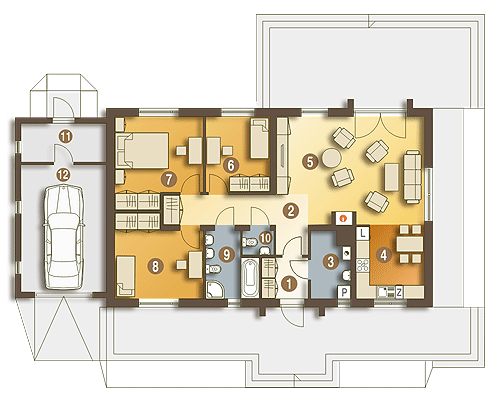 Filipek II to zmodyfikowana wersja popularnego projektu domu Filipek, naszego autorstwa z Galerii Projektów Dom Dla Ciebie. Jest to nadal dom parterowy z przybudowanym garażem jednostanowiskowym, który dostępny jest oczywiście w różnych wariantach: z garażem dwustanowiskowym jak i bez garażu. Warianty z garażem można z powodzeniem wykorzystać do zabudowy bliźniaczej, a każdy z wariantów jest dostępny w lustrzanym odbiciu. Funkcjonalnie w projekcie przewidziano wyraźny podział na strefę ogólną, do której zaliczymy salon i otwartą kuchnię oraz prywatną z trzema sypialniami i wygodną łazienką. Częśc gospodarcza - pomieszczenie usytuowane za garażem, daje mozliwość wykorzystania zmiany miejsca zlokalizowania kotłowni, która w projekcie przewidziana jest w budynku mieszkalnym. W projekcie, jako paliwo grzewcze przewidziano paliwo gazowe, jednak dzięki wielkości kotłowni i bezpośredniemu dostępowi do komina, z powodzeniem można tu zastosować piec np. na tańsze paliwo - stałe. *Do podanej powierzchni użytkowej nie wliczono powierzchni garażu i pomieszczenia technicznego... Sprawdź inne projekty domów - Zapraszamy !fundamenty: BETONOWE ściany zewnętrzne: POROTHERM+STYROPIAN TERMO ORGANIKA ściany wewnętrzne: POROTHERM rodzaj stropu: TERIVA elewacje: TYNK STRUKTURALNY/ OKŁADZINA DREWNIANA/DREWNOPODOBNA pokrycie dachu: DACHÓWKA CERAMICZNA