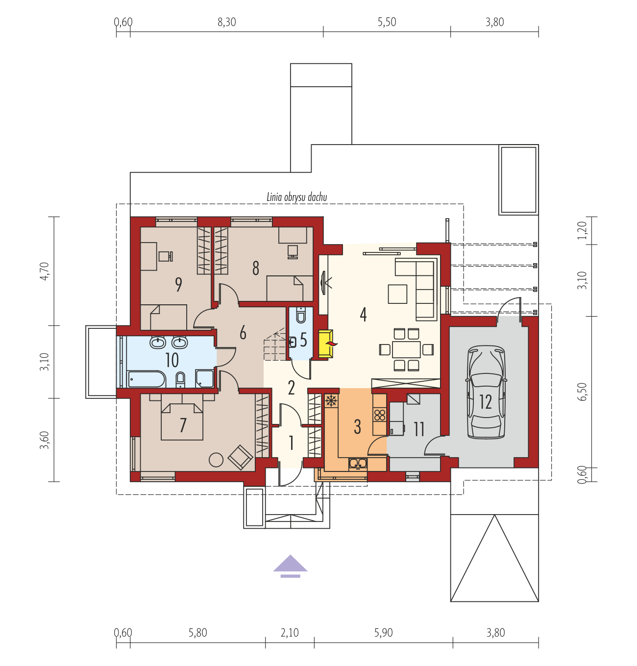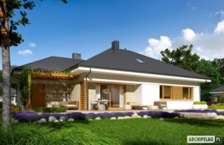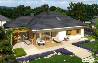 Charakterystyka: Dom parterowy z poddaszem do późniejszej adaptacji na cele mieszkalne, niepodpiwniczony, z garażem jednostanowiskowym Przeznaczenie: Dom dla 3-4-osobowej rodzinyTechnologia i konstrukcja:Fundamenty: ławy, bloczki betonowe 24 cm, ocieplenie styropian 15 cm Ściany zewnętrzne: murowane, cegła ceramiczna 24 cm, ocieplenie styropian Termo Organika 20 cm Ściany wewnętrzne: murowane, cegła ceramiczna, ściany nośne 24 cm, ścianki działowe 12 cm Podłoga na gruncie: płyta betonowa, ocieplenie styropian 10 cm Strop: strop gęstożebrowy Teriva, ocieplenie styropian 30 cm Dach: konstrukcja drewniana, dachówka ceramiczna płaska Bergamo firmy Röben, w przypadku wykorzystania poddasza jako mieszkalne - ocieplenie dachu: wełna mineralna firmy ISOVER 30 cm, więźba dachowa dostępna również w systemie prefabrykacji drewnianejInne: schody wewnętrzne drewnianeRozwiązania instalacyjne:Ogrzewanie: kocioł gazowy kondensacyjny firmy Viessmann, rozprowadzenie ciepła: grzejniki firmy PurmoWentylacja: grawitacyjna OZE: kolektory słoneczne firmy Viessmann Dodatkowo: stacja uzdatniania wody firmy Viessmann Wykończenie:Elewacja: tynk cienkowarstwowy mineralny z palety firmy Termo Organika, okładzina z płyty HPL z naturalną okleiną drewnianą firmy Prodema, okładzina klinkierowa Stolarka: drewniana, PCV lub aluminiowa, drzwi wewnętrzne i wejściowe oraz brama garażowa firmy Hörmann Okna połaciowe: rozwiązania technologiczne firmy Velux, wyłaz dachowy Velux Inne: żaluzja zewnętrzna drewniana, ażurowa pergola drewnianaOtoczenie: system tarasowy ProDeck - deska kompozytowa Terra w kolorze orzechWersje - zapytaj o dostępność: - Flo III - bez garażu lub z garażem dwustanowiskowym - Flo II – podobny układ funkcjonalny, inne wykończenie elewacji, bez garażu- Flo II MULTI-COMFORT – dom z rozwiązaniami Grupy Saint-Gobain, podobny układ funkcjonalny, inne wykończenie elewacji, bez garażu- Flo – podobny układ funkcjonalny, bez poddasza do adaptacji na cele mieszkalne, inne wykończenie elewacji, bez garażu- Odbicie lustrzane do każdej wersjiIstnieje techniczna możliwość: - podpiwniczenia budynku - zbliźniaczenia Atuty projektu okiem architekta: - Bryła o bardzo dobrych parametrach cieplnych dzięki odpowiedniej izolacji przegród zewnętrznych - Funkcjonalne i ergonomiczne wnętrze z podziałem na strefę dzienną i nocną - Wygodna kuchnia z praktyczną przestrzenią gospodarczą w pobliżu - Reprezentacyjny salon z kominkiem oferujący wiele możliwości aranżacji - Możliwość wykorzystania poddasza na część mieszkalną - Możliwość wykonania adaptacji poddasza w drugim etapie budowy - Dwie funkcjonalne szafy wnękowe w strefie wejściowej - Podcień nad dużym przeszkleniem salonu - ochrona pomieszczenia przed przegrzewaniem