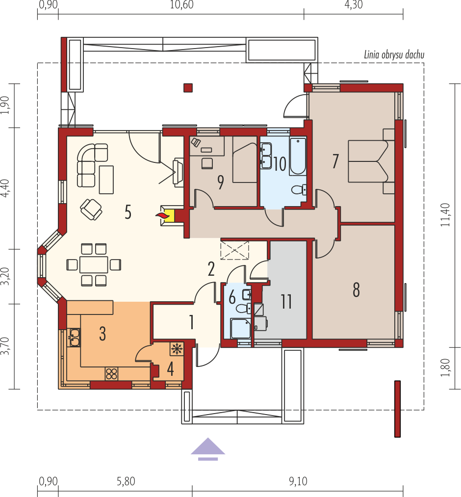 Charakterystyka: Dom parterowy, niepodpiwniczony Przeznaczenie: Dom dla 3-4 osobowej rodzinyTechnologia i konstrukcja: Ściany zewnętrzne: murowane Strop: gęstożebrowy Dach: konstrukcja drewniana, dachówka ceramicznaRozwiązania instalacyjne: Ogrzewanie: kocioł gazowy, rozprowadzenie ciepła: grzejniki Wentylacja: grawitacyjna Wykończenie: Elewacje: tynk mineralny i okładzina klinkierowa Stolarka: drewniana lub PCVWersje - zapytaj o dostępność: - Florenc II G1 - wersja z wbudowanym garażem jednostanowiskowym - Florenc III G1 - wersja z dobudowanym do bryły budynku garażem jednostanowiskowym - Odbicia lustrzane do wszystkich wersji Istnieje techniczna możliwość: - podpiwniczenia budynku