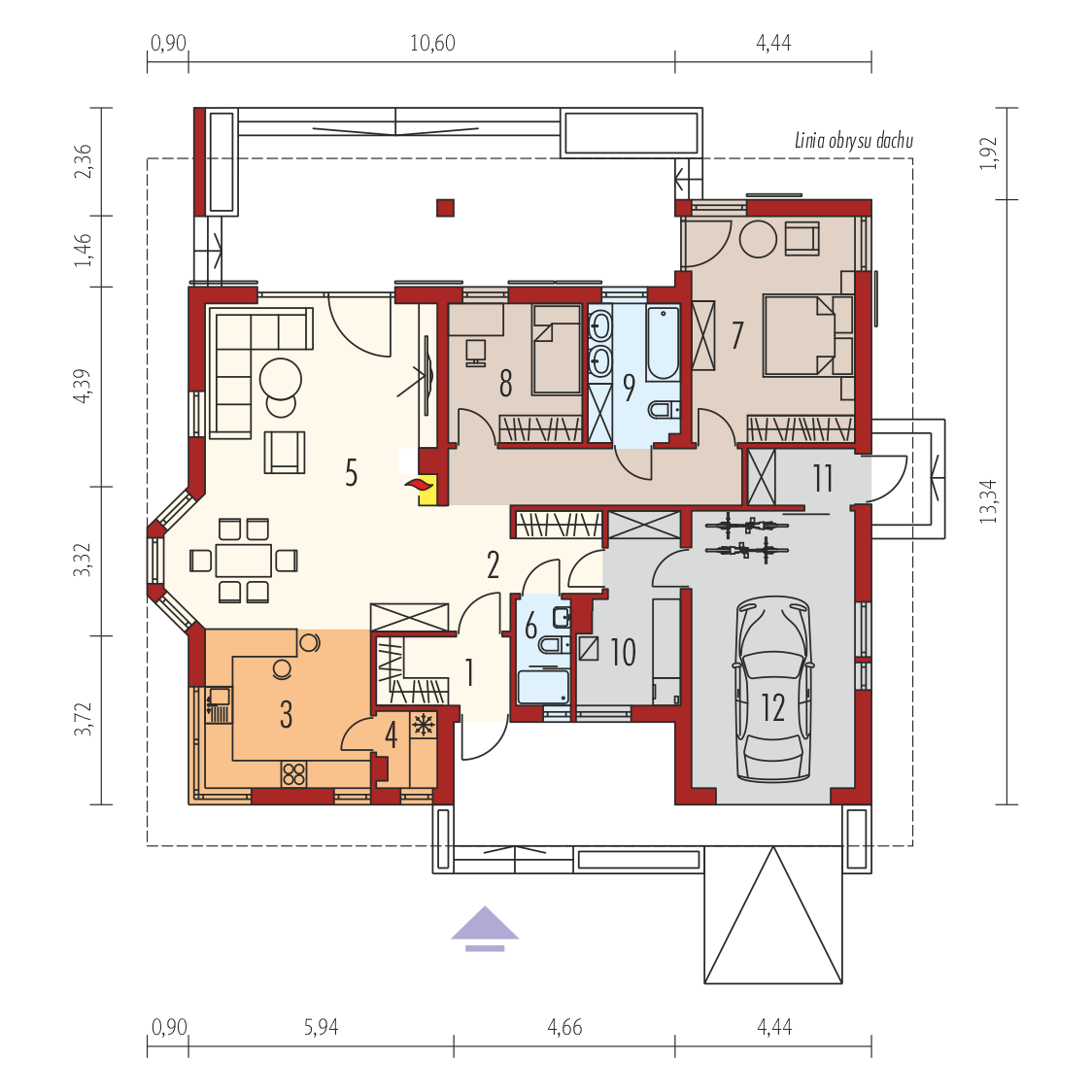 Charakterystyka: Dom parterowy, niepodpiwniczony, z garażem jednostanowiskowym Przeznaczenie: Dom dla 2-3 osobowej rodzinyTechnologia i konstrukcja: Ściany zewnętrzne: murowane, dwuwarstwowe, beton komórkowy 24 cm, ocieplenie wełna mineralna 20 cmŚciany wewnętrzne: nośne i działowe murowane, cegła wapienno-piaskowa 24 cm i 12 cm Strop: gęstożebrowy Teriva, ocieplenie wełna mineralna Isover 30 cm Dach: konstrukcja drewniana, dachówka ceramiczna firmy RöbenRozwiązania instalacyjne:Ogrzewanie: kocioł gazowy kondensacyjny firmy Viessmann, rozprowadzenie ciepła: grzejniki firmy PurmoWentylacja: grawitacyjnaWykończenie: Elewacje: tynk mineralny, okładzina klinkierowa Stolarka: drewniana lub PCV Otoczenie: kostka betonowa i płyty tarasowe firmy Libet Wersje - zapytaj o dostępność: - Florenc – podobny układ funkcjonalny, 3 sypialnie, bez garażu - Florenc III G1 – podobny układ funkcji, 2 sypialnie i gabinet, dostawiony garaż jednostanowiskowy - Odbicie lustrzane do każdej wersji Wszystkie wersje domów możliwe w dwóch standardach/wariantach instalacyjnych: - ENERGO: piec gazowy kondensacyjny, grzejniki, wentylacja grawitacyjna - ENERGO PLUS: pompa ciepła, ogrzewanie podłogowe, wentylacja mechaniczna, dodatkowo system solarny lub panele fotowoltaiczne Istnieją techniczne możliwości wykonania zmian: - podpiwniczenia budynku - zmiany kąta nachylenia dachu do 30° lub 35° i adaptacji poddasza na cele mieszkalne - wykonania budynku w technologii szkieletowej - dokonania zmian funkcjonalnych wg indywidualnych wymagań