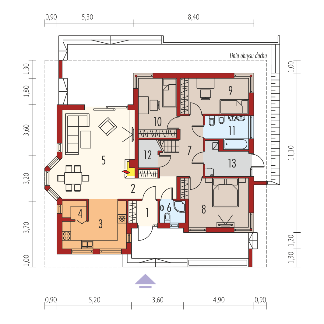 Uwaga! Przedstawione wizualizacje prezentują wersję domu z dachem o kącie nachylenia 22° Charakterystyka: Dom parterowy, niepodpiwniczonyPrzeznaczenie: Dom dla 3-4-osobowej rodziny Technologia i konstrukcja:Ściany zewnętrzne: murowane, dwuwarstwowe, beton komórkowy 24 cm, ocieplenie wełna mineralna 12 cmŚciany wewnętrzne: nośne i działowe murowane, cegła wapienno-piaskowa 24 cm i 12 cmStrop: gęstożebrowy TerivaDach: konstrukcja drewniana, ocieplenie wełna mineralna 28 cm, dachówka ceramiczna firmy Röben, więźba dachowa dostępna również w systemie prefabrykacji drewnianej Rozwiązania instalacyjne:Ogrzewanie: kocioł gazowy kondensacyjny, rozprowadzenie ciepła: grzejnikiWentylacja: grawitacyjna Wykończenie:Elewacje: tynk cienkowarstwowy mineralny, okładzina drewniana i klinkierowaOtoczenie: płyty tarasowe firmy Libet, system tarasowy ProDeck - deska kompozytowa Terra w kolorze orzech Wersje - zapytaj o dostępność:- Flori – inny układ funkcjonalny, kąt nachylenia dachu 22/25°, bez klatki schodowej, różne wersje garaży- Flori II – kąt nachylenia dachu 22°, różne wersje garaży- Flori III – podobny układ funkcjonalny, kąt nachylenia dachu 28°, inna forma wykusza, różne wersje garaży- Flori III ECONOMIC (wersja A) – podobny układ funkcjonalny, kąt nachylenia dachu 28°, inna forma wykusza, różne wersje garaży- Flori III (wersja B) LecaDOM – układ funkcjonalny jak w wersji A, kąt nachylenia dachu 28°, inna forma wykusza, różne wersje garaży - Flori III (30 stopni), Flori III G2 (30 stopni) - kąt nachylenia dachu 30° - Flori III ECONOMIC (wersja A) 30 stopni - kąt nachylenia dachu 30°, bez garażu, z garażem jedno- i dwustanowiskowym- wszystkie wersje z mniejszymi kątami nachylenia dachu- odmienne wykończenie elewacji do wszystkich wersji - odbicie lustrzane do każdej wersji Istnieje techniczna możliwość:- podpiwniczenia budynku- wykonania budynku w technologii szkieletowej