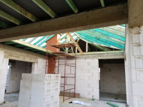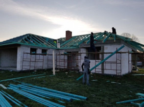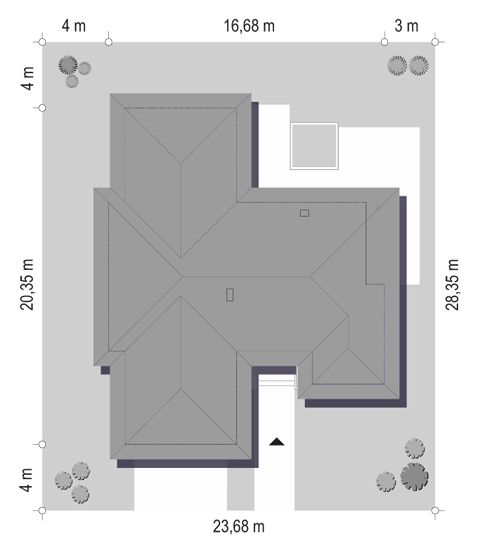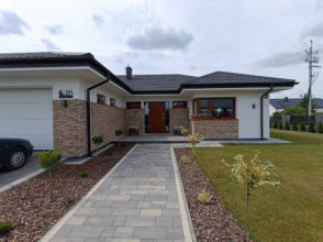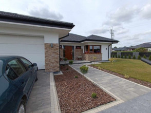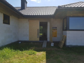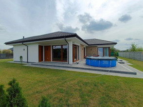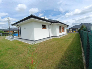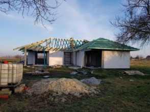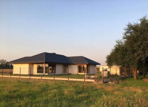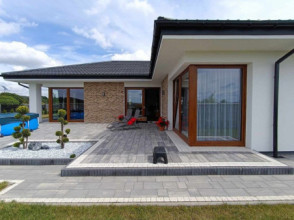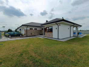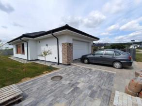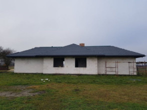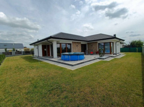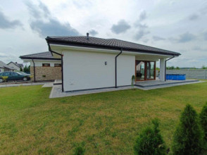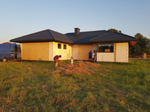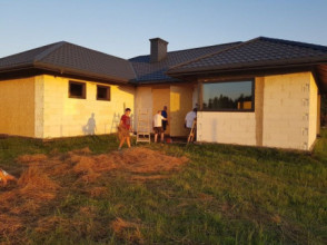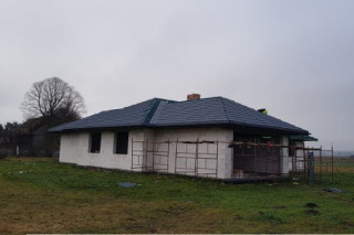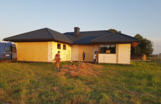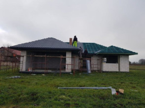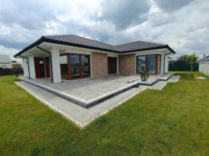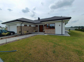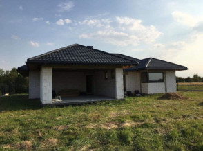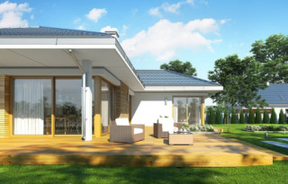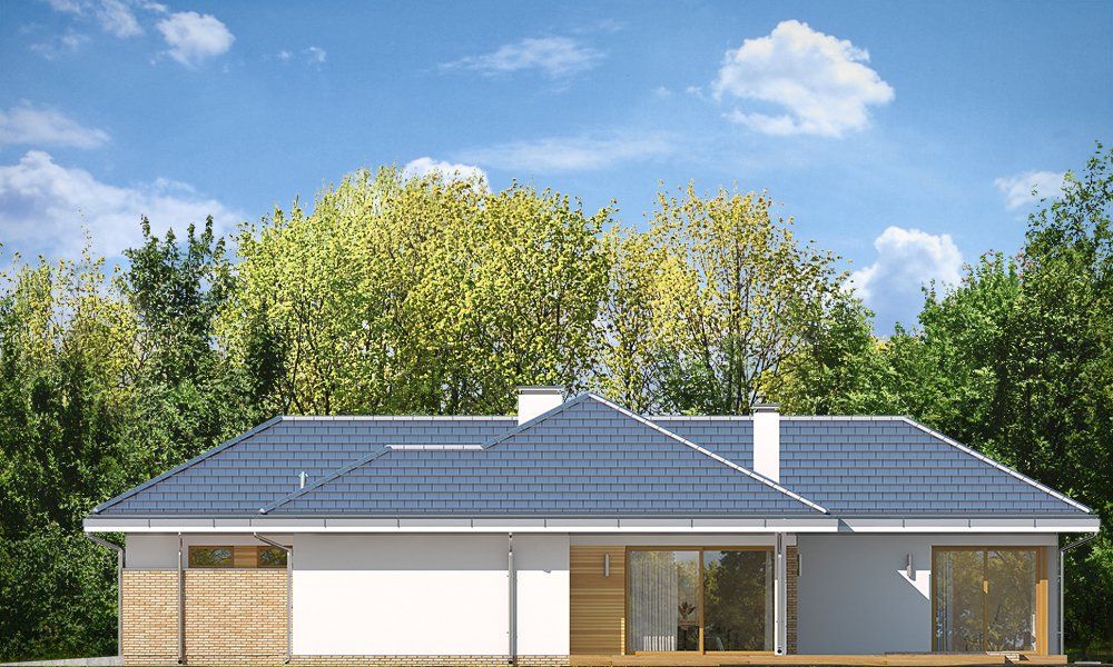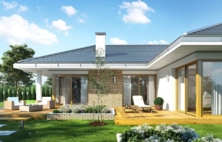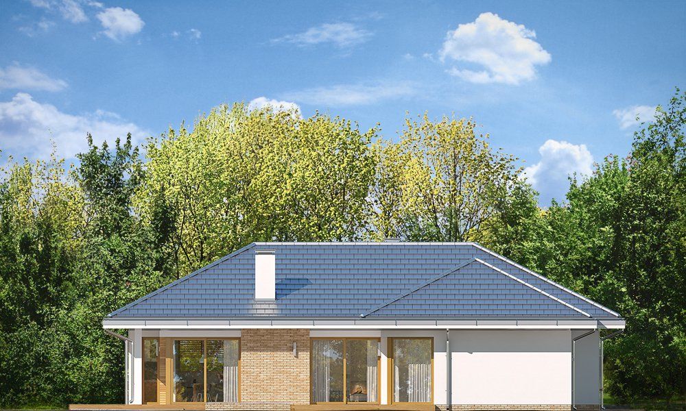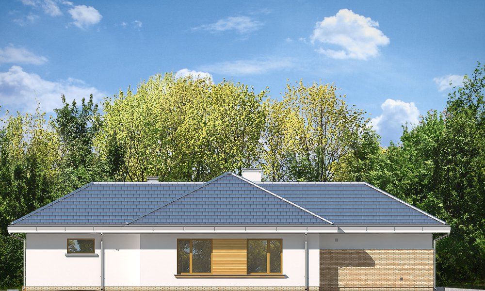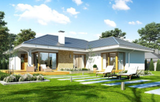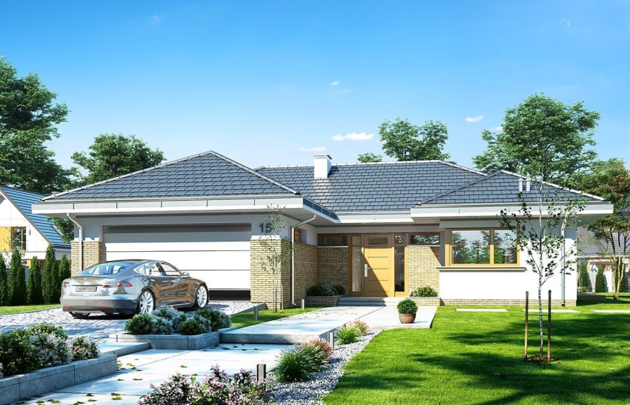 Projekt domu Jedyny to dom jednorodzinny, parterowy, dla 4- 5-osobowej rodziny. Nawiązuje wyglądem do architektury amerykańskich bungalowów z południowych stanów, ale w europejskim murowanym, solidnym wydaniu. Jest to nowoczesny, energooszczędny dom dla rodziny pragnącej zamieszkać blisko ogrodu, na jednym poziomie, bez biegania po schodach. Oczywiście też domek dla szczęśliwców, którzy dysponują ładną działką :). Dom Jedyny zaprojektowano na planie litery T. Front budynku zakomponowano wokół reprezentacyjnego wejścia - wchodzimy po schodkach patio, a stąd z podestu szerokimi pięknymi drzwiami z naświetlami do wnętrza. Obok wejścia mamy piękne narożne okno kuchenne, a z drugiej strony elewacji wystający szeroki garaż. Z kolei elewację ogrodową zdobią piękne narożne przeszklenia łączące wnętrze z tarasem i ogrodem, oraz solidna ceglana ściana komina. Dom całkowicie otwiera się na zieleń łapiąc słońce i wprowadzając ogród do wnętrza. Zasada projektowania środka domu w tym projekcie jest prosta i bezkompromisowa: żadnych klitek, udawanych pokoików. Pokoje są ładne, wymiarowe i funkcjonalnie połączone ze sobą. Projekt domu Jedyny z pewnością będzie dobrą propozycją dla osób mających już za sobą jeden czy dwa nieudane domy i mających wyobrażenie o tym co daje rzeczywisty komfort i wygodę mieszkania. Do domu wchodzimy przez duży przeszklony przedsionek. Na lewo przechodzimy przez szatnię do kotłowni i garażu. Na prawo - przez spiżarnię (magazyn) do pięknej kuchni. Na wprost otwiera nam się bajeczne duża przestrzeń dzienna - miejsce codziennego życia domowników. Przestrzeń dzienna połączona jest z kuchnią, a pięknymi przeszkleniami z tarasem i ogrodem. Na środku salonu mamy komplet kanap, po bokach ścianę TV, i jadalnię, a na wprost ścianę kominkową na tle widocznego przez szyby ogrodu :). Dużą przestrzeń salonu potęguje otwarcie przestrzenne sufitu aż do wysokości dachu. Z części dziennej przechodzimy do prywatnej części domowników. Mamy tutaj holl – pokój ogólny, w którym zmieści się dodatkowa kanapa – taka do posiedzenia sobie, apartament rodziców, z sypialnią w pełni otwartą na ogród, garderobą i łazienką, oraz dwie sypialnie dzieci, dodatkowa łazienka i wc. Nad dużą częścią powierzchni parteru mamy do dyspozycji strych, który można wykorzystać jako domowy magazyn przedmiotów różnych. Dom mimo swojej niewielkiej powierzchni jest bardzo komfortowy i funkcjonalny. Z pewnością będzie się w nim świetnie mieszkało. Do tego dom wg projektu domu Jedyny ma prostą konstrukcję i nie będzie drogi w budowie, a energooszczędne rozwiązania i dobre izolacje zapewnią niedrogie koszty utrzymania. Zapraszamy !