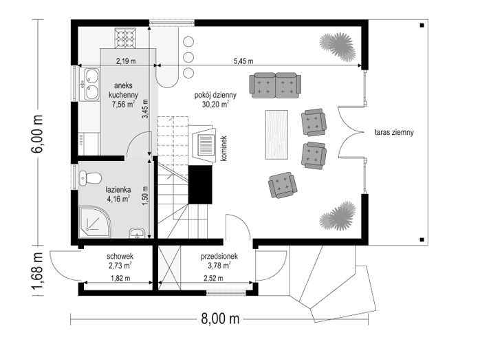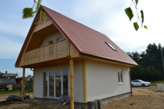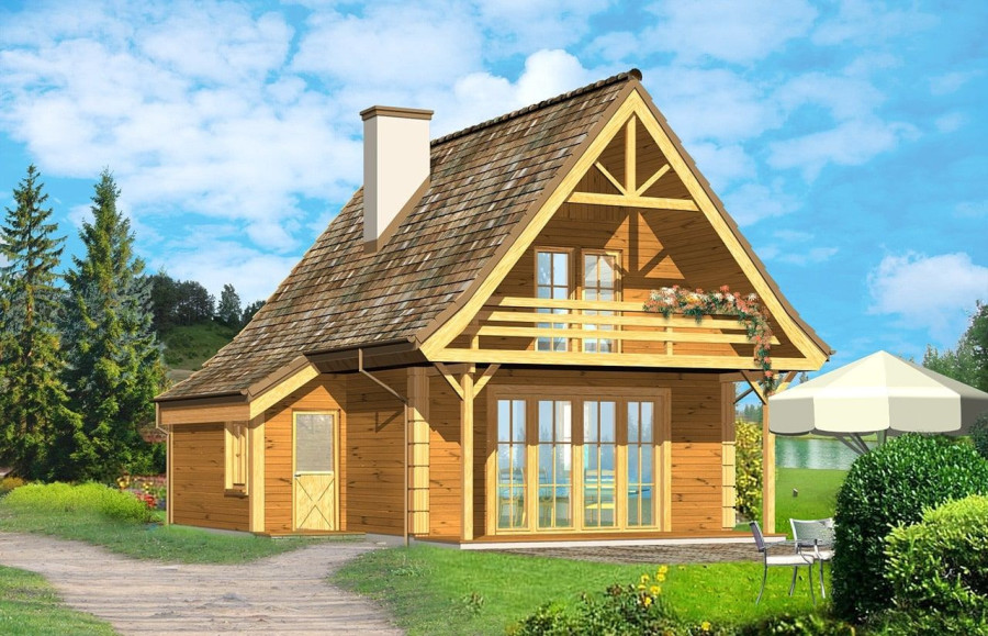Projekt domu Chatka Drewniana to wymarzony dom na działkę rekreacyjną lub do całorocznego zamieszkiwania. Mimo niewielkiej powierzchni cechuje się funkcjonalnym wnętrzem i mieści w sobie wszystkie potrzebne pomieszczenia: na dole wygodny salon z kominkiem, kuchnią i łazienką, na poddaszu 2 lub 3 sypialnie. Pod dużym podcieniem wiszącym nad tarasem można schronić się przed deszczem lub słońcem, zaś z wygodnego balkonu podziwiać piękną okolicę. Pracownia posiada projekt Chatka drewniana w technologii drewnianej szkieletowej oraz w wersji murowanej. Zapraszamy do zapoznania się z pełną ofertą pracowni MG Projekt: Chatka, Chatka 2.