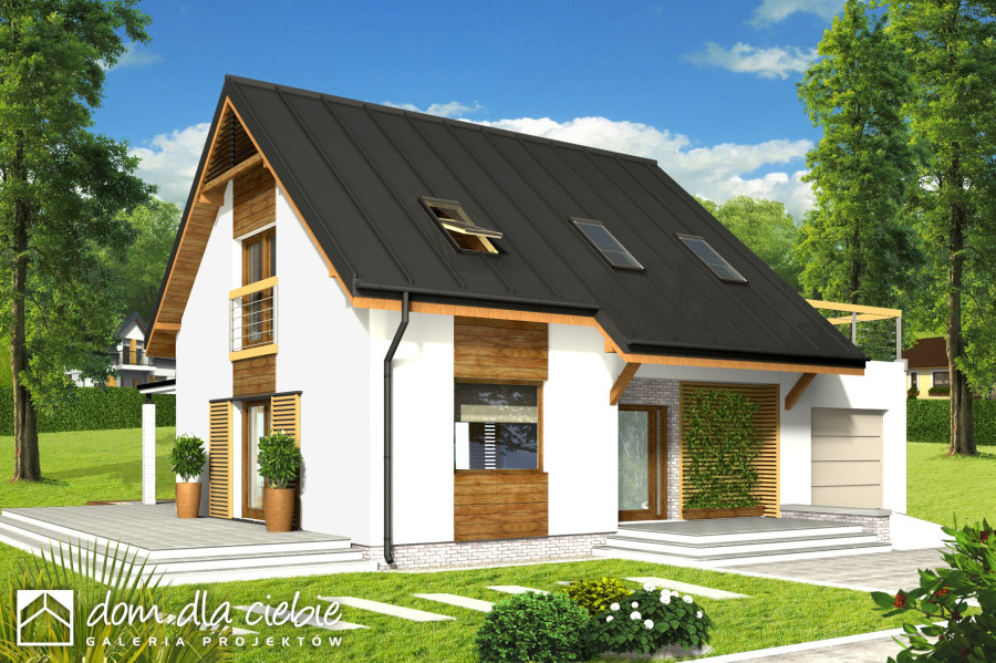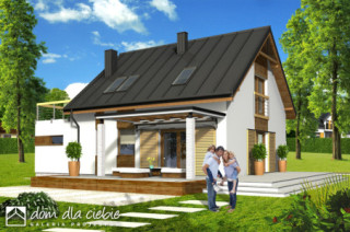 Niewielki, nowoczesny dom jednorodzinny z poddaszem użytkowym i przybudowanym garażem, dla 4 osobowej rodziny. Nieskomplikowana bryła, pozwoli na znaczne obniżenie kosztów budowy (prostokątny obrys domu oraz dach dwuspadowy). Zadbano o prosty rozdział strefy prywatnej zlokalizowanej na poddaszu, od strefy dziennej - użytkowej umieszczonej na parterze. Na parterze w części wejściowej zaprojektowano wiatrołap. Po przejściu z wiatrołapu trafiamy do holu, który został pomyślany jako punkt centralny dolnej kondygnacji. Kolejno wokół niego mamy rozmieszczoną: klatkę schodową prowadzącą na poddasze. Pod klatką jest umieszczone przejście do garażu, w którym znajduje się kotłownia. Wokół holu zaprojektowano również łazienkę, kuchnia oraz salon z kominkiem i wyjściem na taras. Realizując funkcjonalność strefy prywatnej, na poddaszu zaprojektowano trzy sypialnie. Wszystkie sypialnie i wspólna łazienka są dostępne z niedużego, ale wystarczającego holu połączonego z klatką schodową, który posiada wyjście na taras nad garażem. Wyjście na taras posiada również największa sypialnia.fundamenty: BETONOWE ściany zewnętrzne: POROTHERM+STYROPIAN TERMO ORGANIKA ściany wewnętrzne: POROTHERM, G-K rodzaj stropu: TERIVA elewacje: TYNK STRUKTURALNY, OKŁADZINA KLINKIEROWA, OKŁADZINA DREWNIANA pokrycie dachu: BLACHA NA RĄBEK STOJĄCY