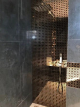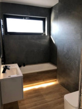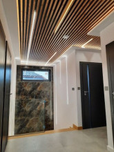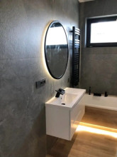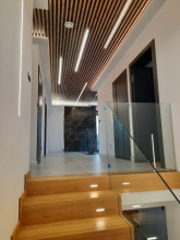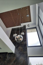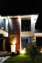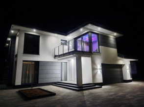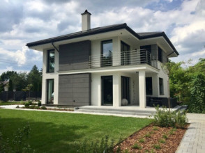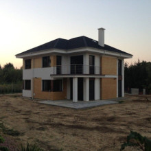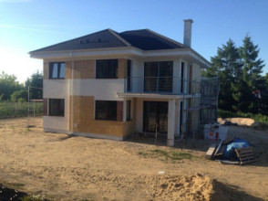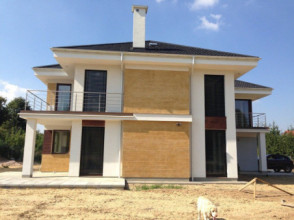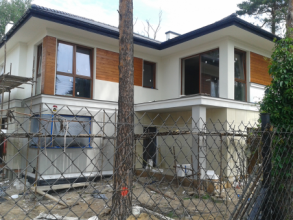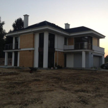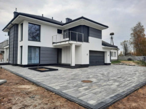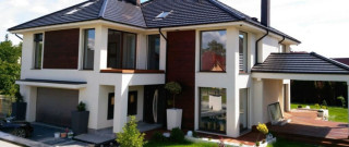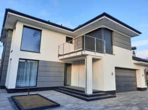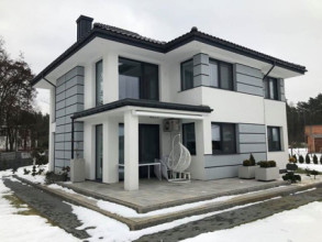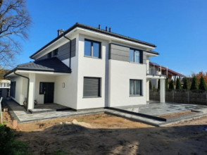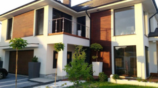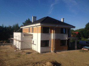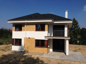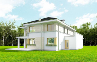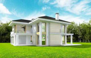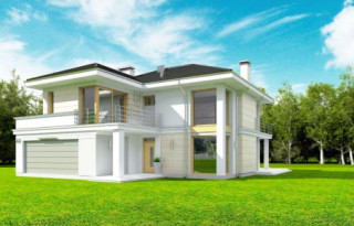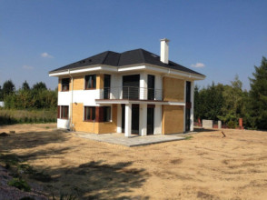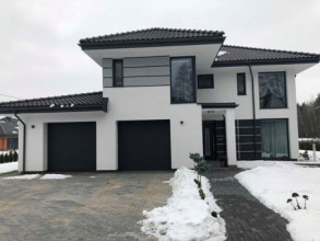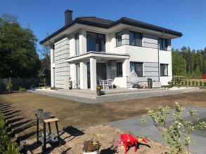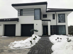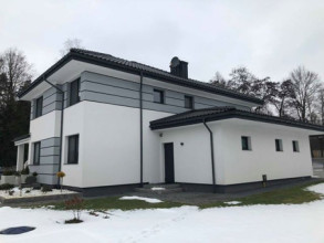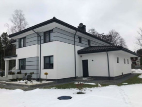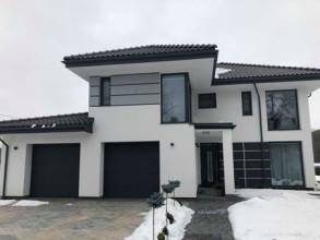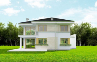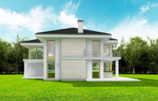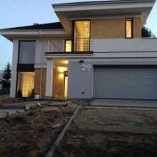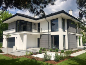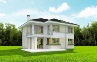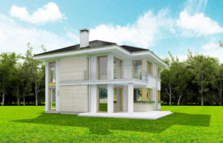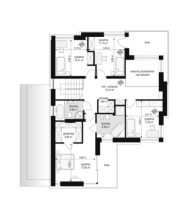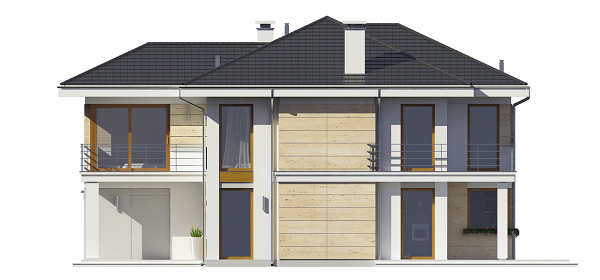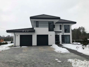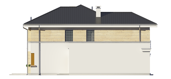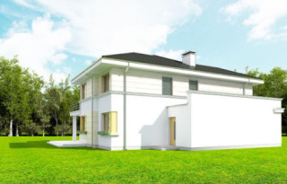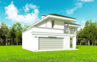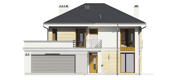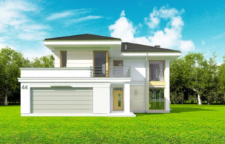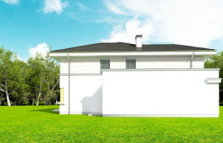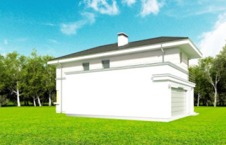 Projekt domu Riwiera 4 to wariant popularnego projektu Riwiera 2 - tym razem z dwustanowiskowym garażem. Projekt domu Riwiera 4 to piętrowy budynek, przewidziany dla 4- 5-osobowej rodziny, przekryty łagodnym wielospadowym dachem, z wbudowanym - częściowo wystającym poza obrys bryły domu - podwójnym garażem. Budynek zaprojektowano w stylu miejskiej nowoczesnej willi, z łagodnymi dachami i dużymi przeszkleniami. Elewacje podzielone zostały na poziome pasy, a ściany urozmaicone różnymi materiałowymi okładzinami. Charakterystycznym elementem domu są piękne duże okna , których część sięga od podłogi do sufitu, zapewniając dużo światła i piękne widoki na ogród z części dziennej. Wnętrze domu podzielono na część dzienną na parterze, oraz sypialnie na piętrze. Parter to otwarta duża przestrzeń dzienna, z salonem, holem i kuchnią, z wydzieloną częściowo jadalnią. Otwarty hol stanowi centrum domu. Z niego dostajemy się reprezentacyjnymi schodami na górę, lub obszernym przedsionkiem na zewnątrz , albo do części gospodarczej domu - do kotłowni i garażu. Na parterze znajduje się dodatkowy pokój (gabinet lub sypialnia gościnna), oraz wc z natryskiem. Nad jadalnią zostawiono otwarty sufit na antresolę piętra, z oknami o wysokości dwóch kondygnacji, z widokiem na ogródek. Reprezentacyjna ściana kominkowo-telewizyjna będzie ozdobą całego domu. Z salonu wychodzimy na częściowo zadaszony taras i do ogrodu. Na piętrze przewidziano cztery sypialnie, w tym apartament rodziców w osobnej części domu, z własną łazienką i garderobą. Sypialnie dziecięce mają dodatkową łazienkę - z holu. Istnieje możliwość zamknięcia pustki nad salonem i zaprojektowania piątego pokoju na piętrze. Projekt domu Riwiera 4 to przemyślany, bardzo funkcjonalny, energooszczędny dom jednorodzinny. Jego koszt budowy wypada korzystnie w stosunku do uzyskanej powierzchni (pozbawionej skosów), oraz komfortu i wygody mieszkania. Dostępna jest opcja w projekcie ze stropem monolitycznym nad parterem i piętrem, wersja w odbiciu lustrzanym projektu oraz inne wersje: bazowa (projekt Riwiera), wersja najmniejsza (projekt domu Riwiera 2) wersja poszerzona (projekt domu Riwiera 3) oraz zmodyfikowana i ulepszona wersja bazowego projektu (Projekt domu Riwiera 5). Zapraszamy!