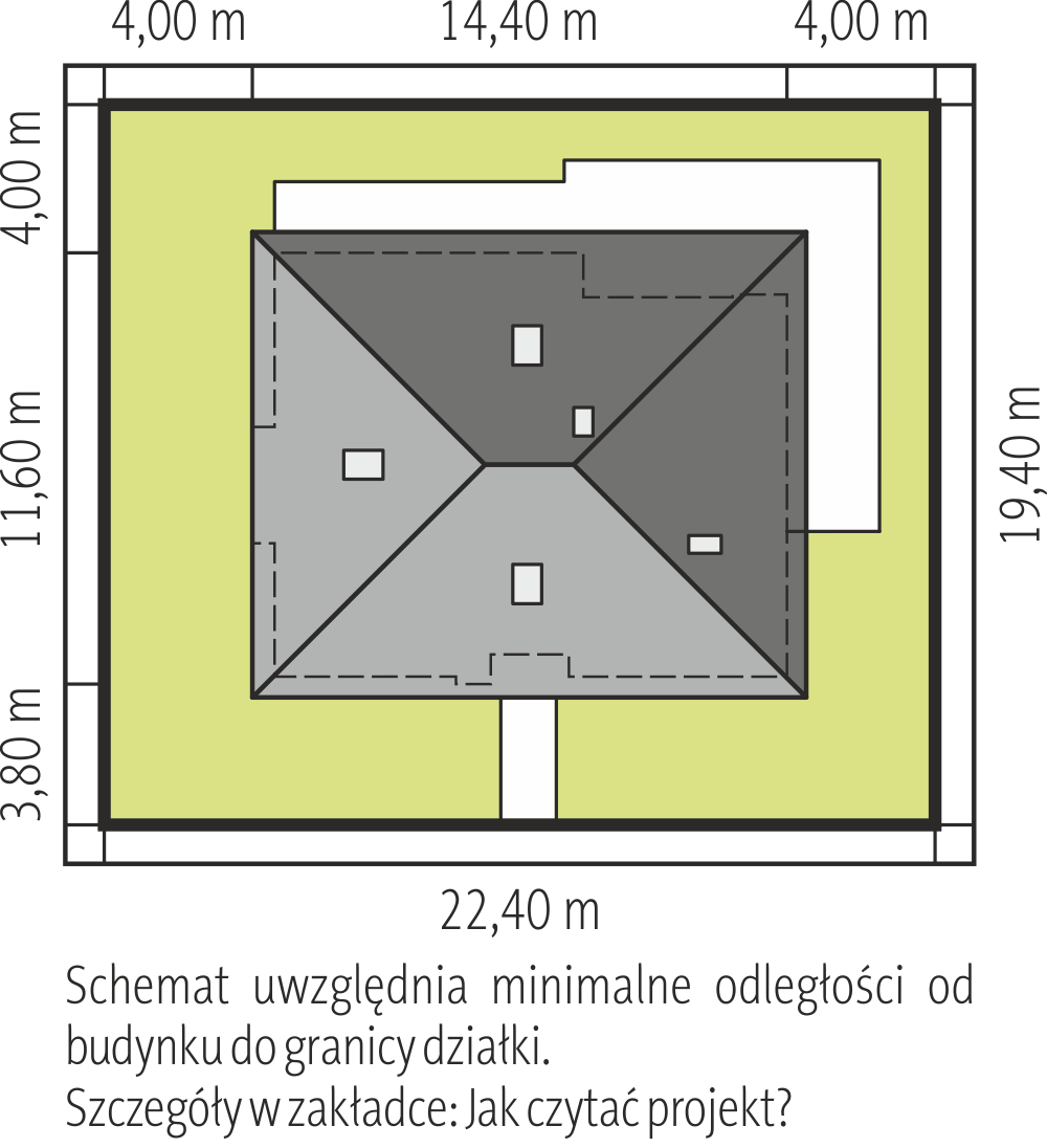 Na parterze zaprojektowano centralnie zlokalizowany hol dostępny przez obszerną sień wejściową. Z holu dostępny jest pokój dzienny otwarty przestrzennie na jadalnię, kuchnia, w.c., pomieszczenie gospodarcze i schody prowadzące na poddasze. Do garażu dostać się można z zewnątrz i przez drzwi z sieni. Na poddaszu zaprojektowano 3 pokoje sypialne, przedpokój i obszerną łazienkę. Bryłę budynku stanowią trzy prostopadłościany zestawione ze sobą równolegle i nakryte dachami dwuspadowymi o kątach nachylenia 42°. Budynek posiada podcień osłaniający wejście. Bryła domu wzbogacona została balkonami z drewnianymi balustradami.