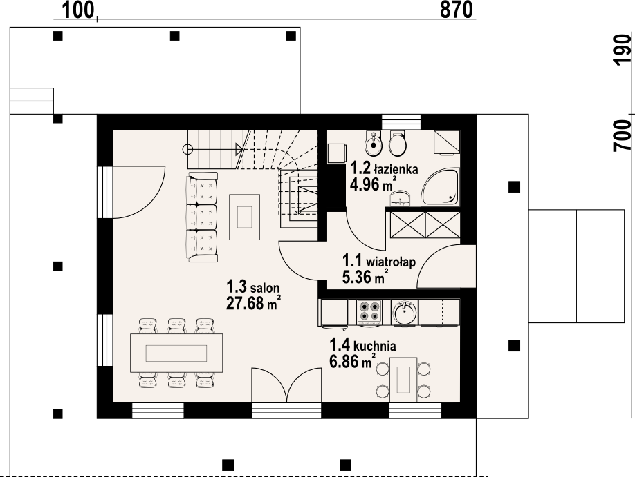 Dzięki wykorzystaniu użytkowego poddasza dom Gaik sudecki dw stwarza warunki dla czteroosobowej rodziny. Na drugiej kondygnacj