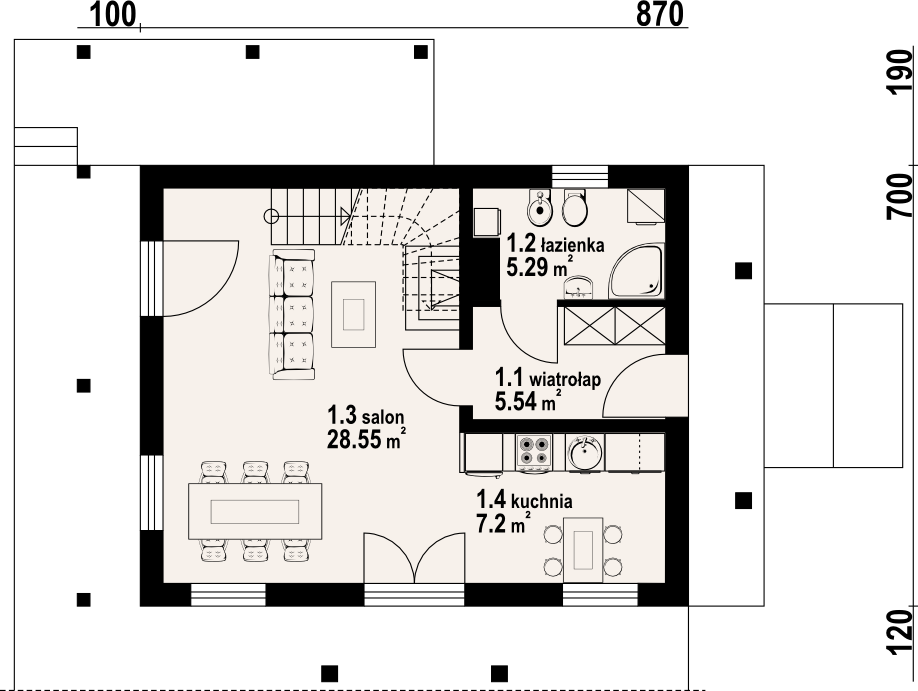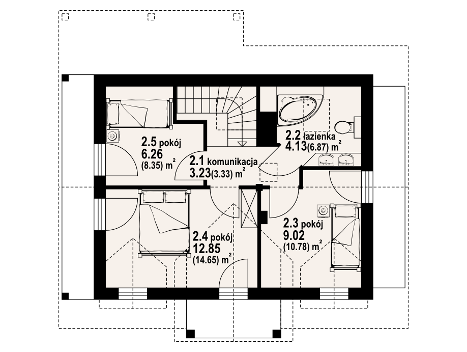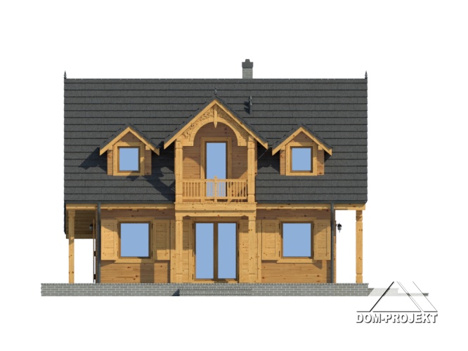 Dom w technologii szkieletu drewnianego. Duży salon z aneksem kuchennym, kominkiem, schodami na poddasze i wyjściem na taras. Łazienka z pralką, wiatrołap. Na poddaszu trzy pokoje, łazienka i komunikacja. Trzy balkony.