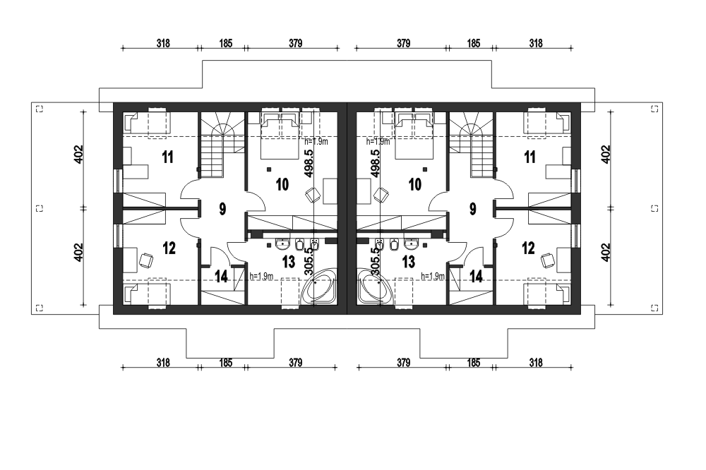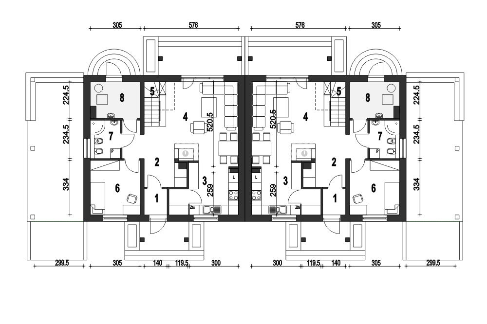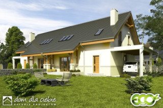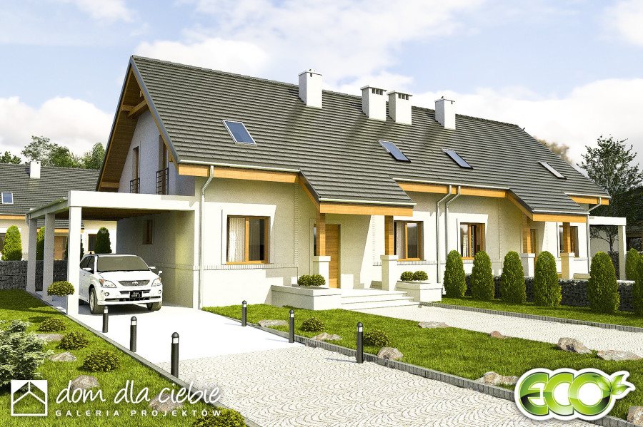 (Uwaga: projekty typu bliźniak oferujemy jako domy dwulokalowe, projekt można zamówić również w zabudowie bliźniaczej) Poniższy opis dotyczy jednego segmentu; Projekt gotowy Gajówka zawiera w swoim programie użytkowym:salon z jadalnią, otwarta kuchnią, schodami na górę i kominkiem oraz witryna ogrodową. Na parterze po za tym znajdują się jeszcze takie pomieszczenia jak: garderoba wiatrołap , WC, garaż i kotłownia oraz spiżarnia. Piętro składa się z przedpokoju, trzech sypialni i łazienki oraz garderoby.Wyraźny podział na strefy dzienną i nocną zapewni mieszkańcom domu wygodę i komfort.Gajówka jest bardzo prosta i oszczędna - będzie tania w budowie i ekonomiczna.