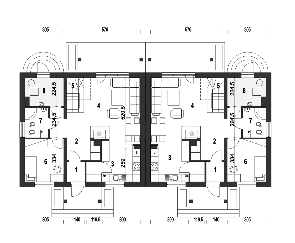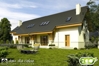 (Uwaga: projekty typu bliźniak oferujemy jako domy dwulokalowe, projekt można zamówić również w zabudowie bliźniaczej) Poniższy opis dotyczy jednego segmentu; Projekt gotowy Gajówka zawiera w swoim programie użytkowym:salon z jadalnią, otwarta kuchnią, schodami na górę i kominkiem oraz witryna ogrodową. Na parterze po za tym znajdują się jeszcze takie pomieszczenia jak: garderoba wiatrołap , WC, garaż i kotłownia oraz spiżarnia. Piętro składa się z przedpokoju, trzech sypialni i łazienki oraz garderoby.Wyraźny podział na strefy dzienną i nocną zapewni mieszkańcom domu wygodę i komfort.Gajówka jest bardzo prosta i oszczędna - będzie tania w budowie i ekonomiczna.