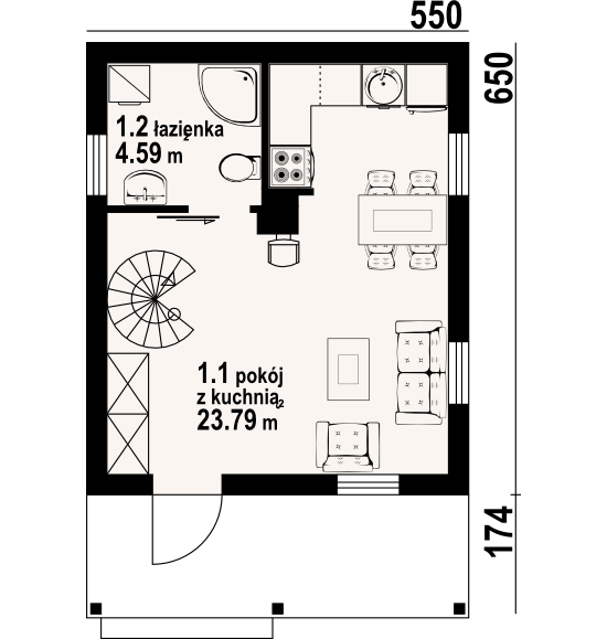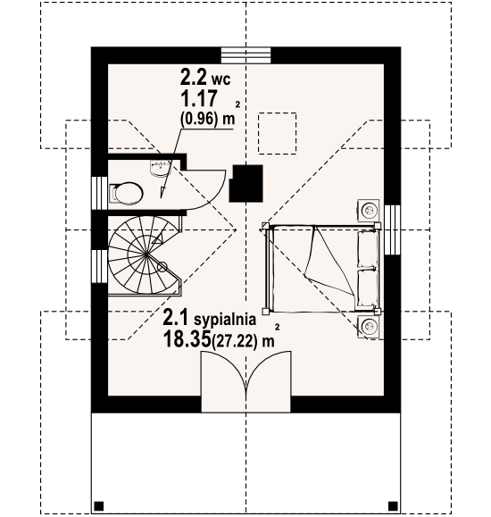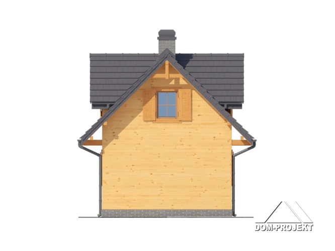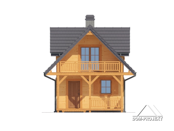 Mały letniskowy dom w konstrukcji szkieletu drewnianego. Na parterze pokój z aneksem kuchennym, łazienką i schodami na poddasze. Na poddaszu sypialnia z dostępnym balkonem oraz wc.
