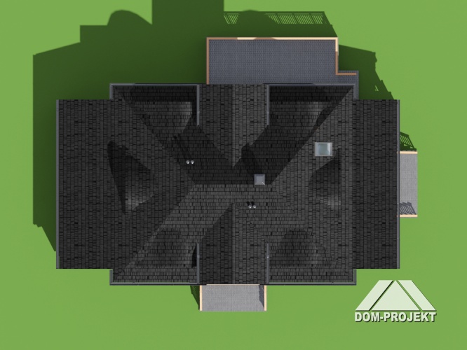 Obszerny parter mieści w części centralnej podłużny hol prowadzący od sieni do pokoju dziennego połączonego z jadalnią i dalej z kuchnią. Po przeciwległej stronie holu rozmieszczono 3 pokoje i łazienkę. Proste dwubiegowe schody prowadzą na poddasze, gdzie umieszczono 3 duże sypialnie, 2 łazienki i garderobę. W poziomie piwnic zlokalizowano garaż, w.c., pomieszczenie gospodarcze i kotłownię z pralnią. Prosta bryła budynku nakryta została dachem dwuspadowym o kącie nachylenia 45°. Jedynym elementem tworzącym charakterystyczny akcent jest całkowicie zadaszony balkon, wsparty na słupach, tworzący głęboki podcień wejściowy.