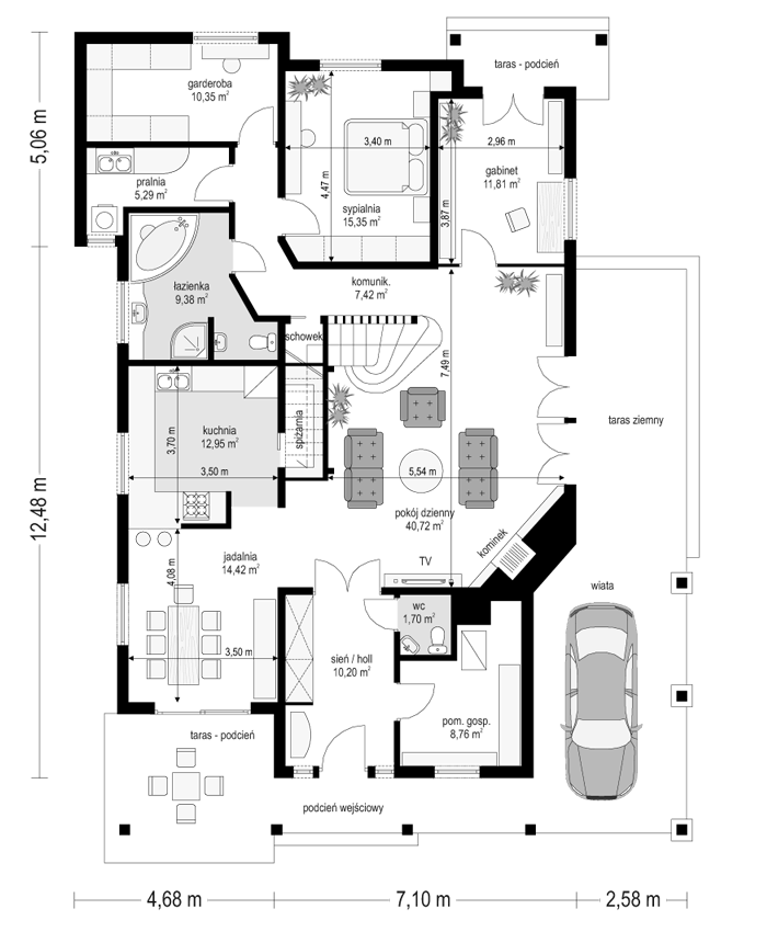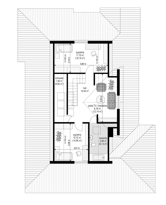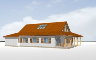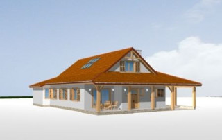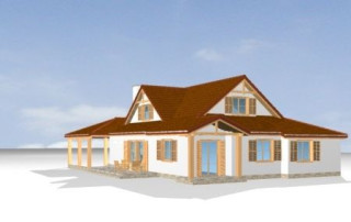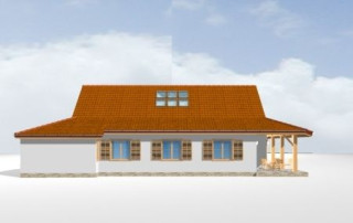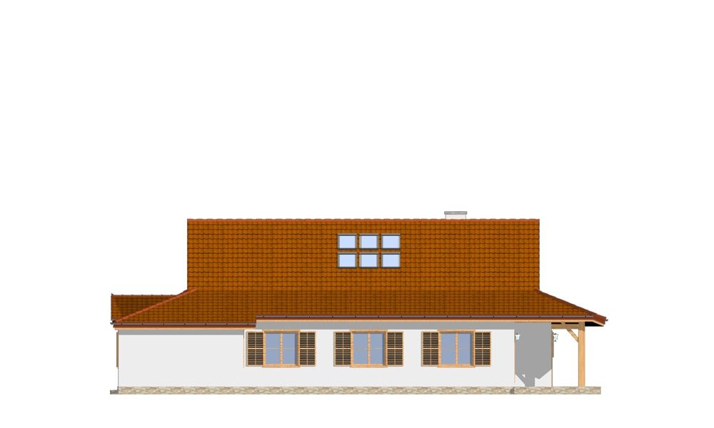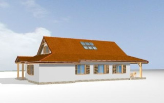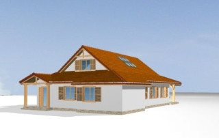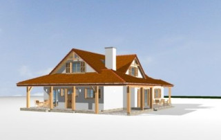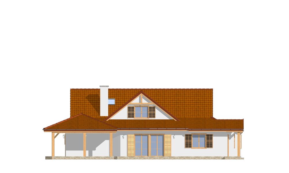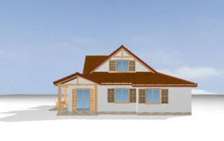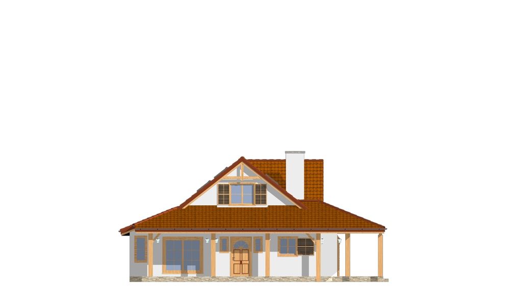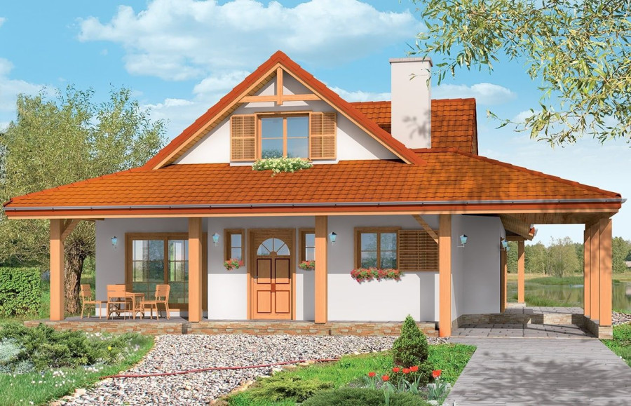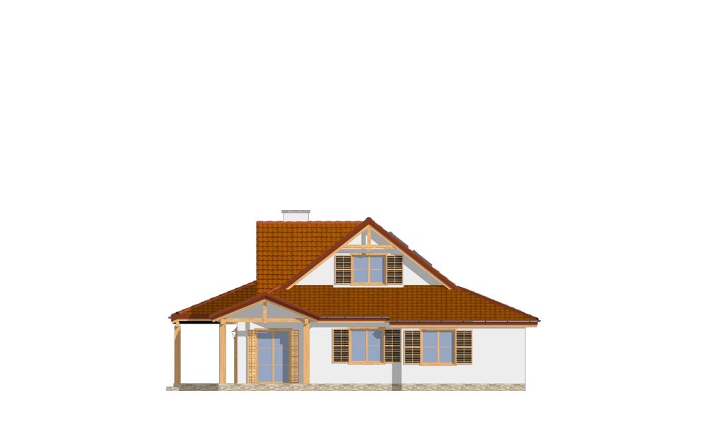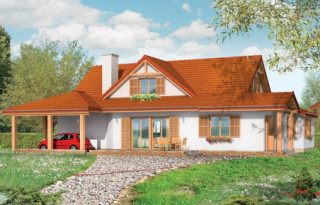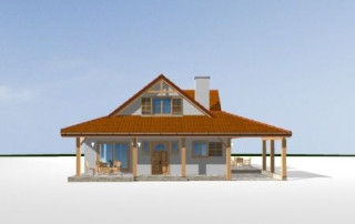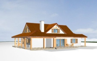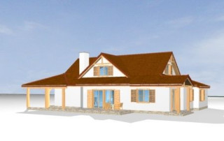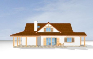 Projekt domu Czapla to niezwykły domek. Jest tak uroczy i oryginalny, że trudno jest na niego nie zwrócić uwagi. Budynek zaprojektowany został w technologii szkieletowej drewnianej. Dom przeznaczony jest dla rodziny 4- 5-osobowej. Projekt domu Czapla ma rozbudowany rzut parteru i mniejsze poddasze użytkowe. Otoczony jest bocznymi daszkami, werandami, podcieniami i wiatami. Podcienie podparte są rzędami drewnianych kolumn. Z dachu wystają na trzech elewacjach malownicze szczyciki ze środkowo osadzonymi oknami. Dachy o różnych kształtach i kątach nachylenia dają bardzo ciekawy efekt. Dom nie należy do małych, ale dzięki dobrze dobranym proporcjom całość bryły ma skalę człowieka. Sylwetka domu zdaje się wrastać w ziemię, wtapiać w otoczenie. Nie ma tu dużych pustych ścian, a wszystkie drzwi i okna otwierają wnętrze na otaczający ogród. Wnętrze domu Czapla również jest nietuzinkowe. Na parterze zaprojektowano jednoprzestrzenną część dzienną, której centralnym miejscem jest salon z reprezentacyjnymi schodami. Z salonu przechodzi się do kuchni połączonej z jadalnią - z własnym podcienionym tarasem, również do apartamentu rodziców za schodami - z sypialnią, łazienką i garderobą, z salonu jest również połączenie z przytulnym gabinetem - także z własnym wyjściem do ogrodu. Wreszcie z salonu jest połączenie z sienią-holem, pełniącym funkcję szatni i strefy wejściowej domu. Z sieni natomiast możemy dostać się do kotłowni. Na parterze jest wiele wyjść na do ogrodu z różnych pomieszczeń, są trzy podcienie i jeden odsłonięty taras. Przy wejściu zaprojektowano wiatę na samochód. W projekcie Czapla, na poddaszu zaplanowano dwie sypialnie dziecięce i łazienkę. Z dużego holu na poddaszu można też wygrodzić dodatkowy trzeci pokój. Projekt domu Czapla jest również w wersji odbicia lustrzanego.