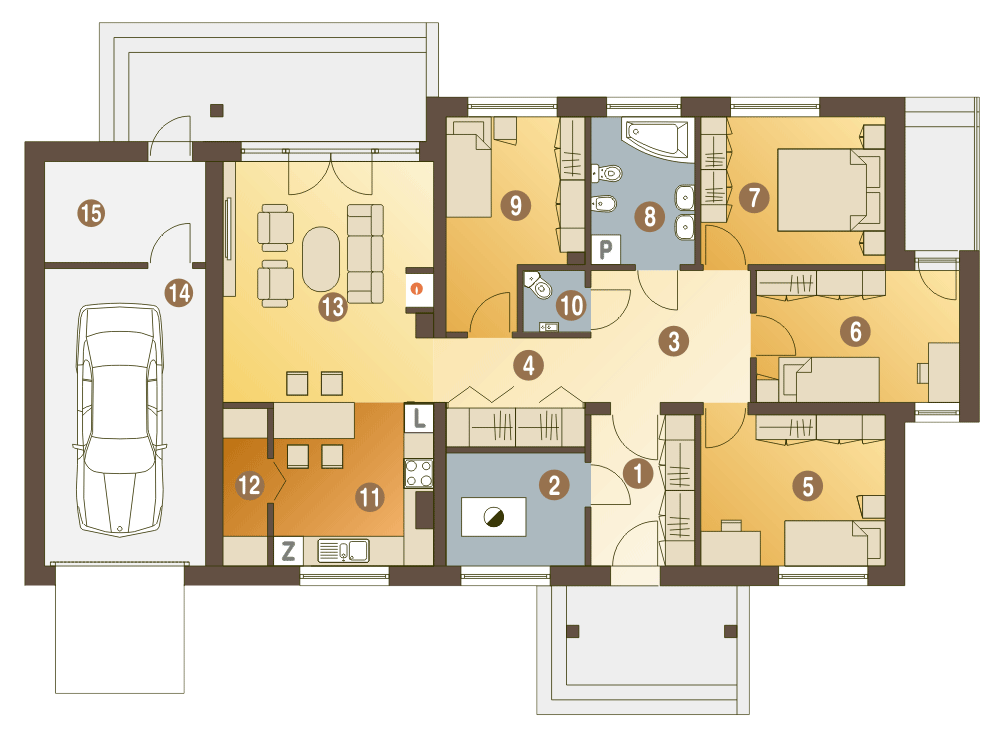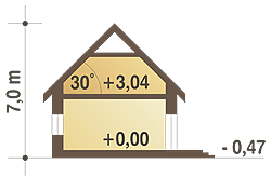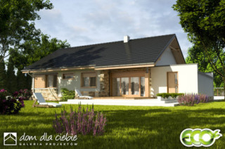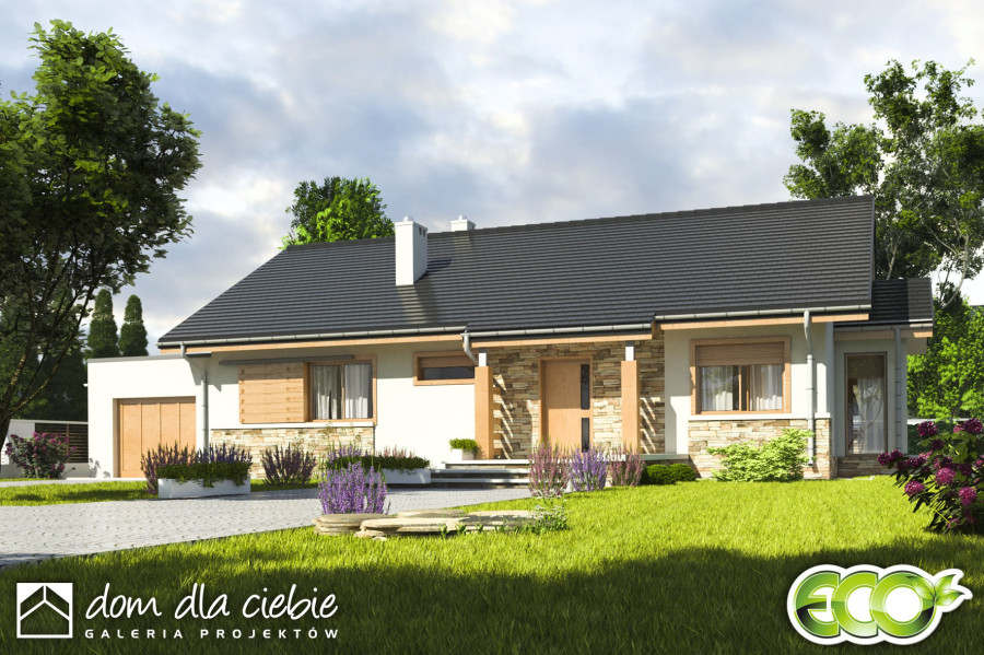 Projekt Gąska prezentuje wygodny parterowy dom jednorodzinny dla 4-5-cio osobowej rodziny. Domek mieści w sobie cztery sypialnie i salon, łazienkę, WC rozplanowane wokół centralnego holu. Druga część holu została połączona z funkcją garderoby. Kuchnię zaprojektowano jako otwartą na salon, przy której mamy spiżarnię. Parametry kotłowni - dostępnej z wiatrołapu - pomieszczenia technicznego umożliwiają ogrzewanie dom gazem lub paliwem stałym (do wyboru). Do budynku, od strony kuchni, zaproponowano garaż jednostanowiskowy z płaskim dachem. Na elewacji budynku zaproponowano materiał drewniany i kamienny.