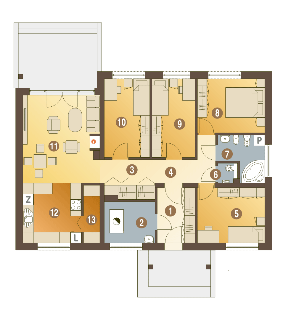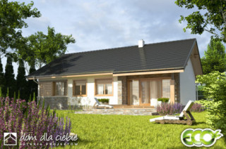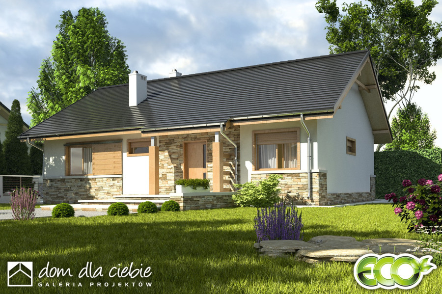 Projekt Gąska II to wygodny parterowy dom jednorodzinny dla 4-5-cio osobowej rodziny. Domek mieści w sobie cztery sypialnie i salon, łazienkę, WC rozplanowane wokół centralnego holu. Druga część holu została połączona z funkcją garderoby. Kuchnię zaprojektowano jako otwartą na salon, przy której mamy spiżarnię. Parametry kotłowni - dostępnej z wiatrołapu - pomieszczenia technicznego umożliwiają ogrzewanie dom gazem lub paliwem stałym (do wyboru). Do części mieszkalnej przylega duży garaż jednostanowiskowy z wejściem z zewnątrz. Na elewacji budynku zaproponowano materiał drewniany i kamienny.