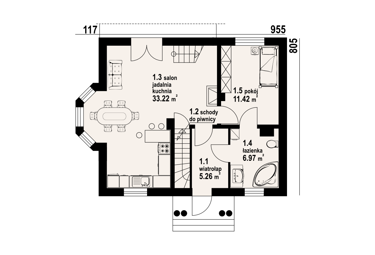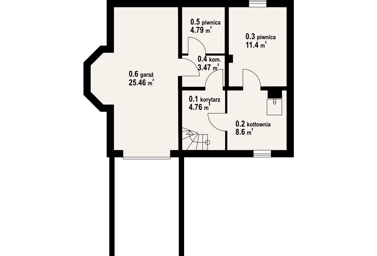 Dom z poddaszem użytkowym i pełnym podpiwniczeniem. W piwnicach garaż oraz pomieszczenia gospodarcze. Na parterze aneks kuchenny otwarty na salon z którego prowadzą schody na poddasze, pokój, łazienka. Na poddaszu trzy pokoje i łazienka.