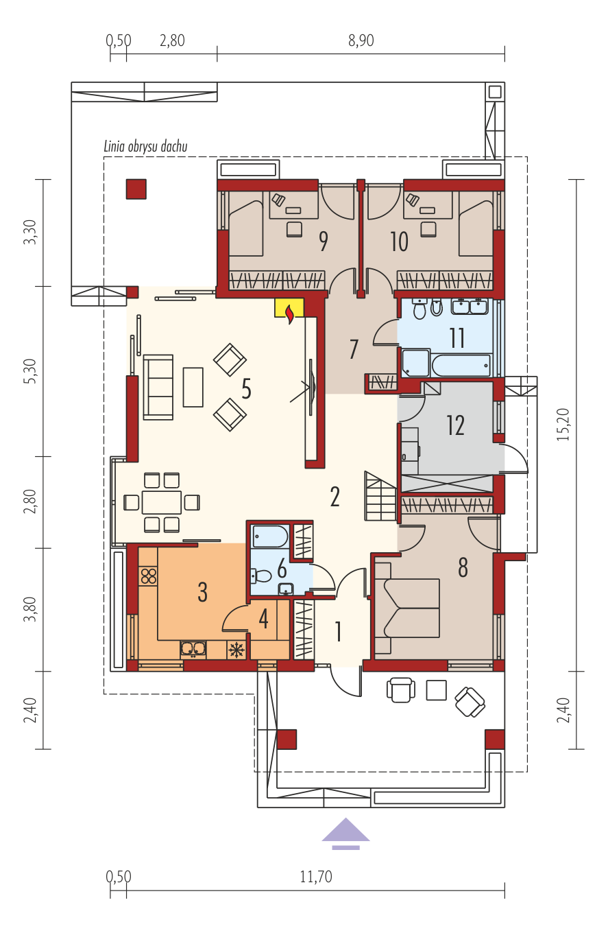 Charakterystyka: Dom parterowy z poddaszem do późniejszej adaptacji na cele mieszkalne, niepodpiwniczonyPrzeznaczenie: Dom dla 3-4-osobowej rodziny Technologia i konstrukcja:Ściany zewnętrzne: murowane, dwuwarstwowe, pustaki ceramiczne 24 cm, ocieplenie styropian Termo Organika 12 cmŚciany wewnętrzne: nośne i działowe murowane, pustaki ceramiczne 24 cm i 12 cmStrop: międzypiętrowy gęstożebrowy TerivaDach: konstrukcja drewniana, ocieplenie wełna mineralna Isover 28 cm, dachówka ceramiczna firmy Röben, więźba dachowa dostępna również w systemie prefabrykacji drewnianejInne: w przypadku adaptacji poddasza - schody wewnętrzne drewniane Rozwiązania instalacyjne:Ogrzewanie: kocioł gazowy kondensacyjny firmy Viessmann, rozprowadzenie ciepła: grzejniki firmy Purmo Wentylacja: grawitacyjna OZE: kolektory słoneczne firmy Viessmann Dodatkowo: stacja uzdatniania wody firmy ViessmannWykończenie:Elewacje: tynk cienkowarstwowy mineralny w kolorze TO-PA001 z palety firmy Termo Organika, okładzina z płyty HPL z naturalną okleiną drewnianą firmy ProdemaStolarka: drewniana, PVC lub aluminiowa, drzwi wejściowe firmy HörmannOkna połaciowe: rozwiązania technologiczne firmy VeluxOtoczenie: kostka betonowa i płyty tarasowe firmy Libet, system tarasowy ProDeck Wersje - zapytaj o dostępność:- Glen III – z garażem jedno- i dwustanowiskowym - Glen – podobny układ funkcjonalny, dom parterowy, bez poddasza do adaptacji, kąt nachylania dachu 30°, różne wersje garaży - Glen II - podobny układ funkcjonalny, bez poddasza do adaptacji, kąt nachylania dachu 30°, bez garażu lub z garażem dwustanowiskowym - Glen II G1 Leca® DOM – dom w technologii Leca® KERAMZYTU - Glen II Multi-Comfort - dom z rozwiązaniami technologiczno-materiałowymi Grupy Saint-Gobain, różne wersje garaży - Glen IV – podobny układ funkcjonalny, ścianki działowe w technologii szkieletowej Rigips, prefabrykowane wiązary dachowe, bez ścian nośnych i stopu żelbetowego, różne wersje garaży - Glen V – podobny układ funkcjonalny, ściany zewnętrzne trójwarstwowe, wykończenie klinkierowe elewacji, różne wersje garaży- każda wersja z inną propozycją wykończenia elewacji - Odbicie lustrzane do każdej wersji Istnieje techniczna możliwość:- podpiwniczenia budynku- wykonania budynku w technologii szkieletowej