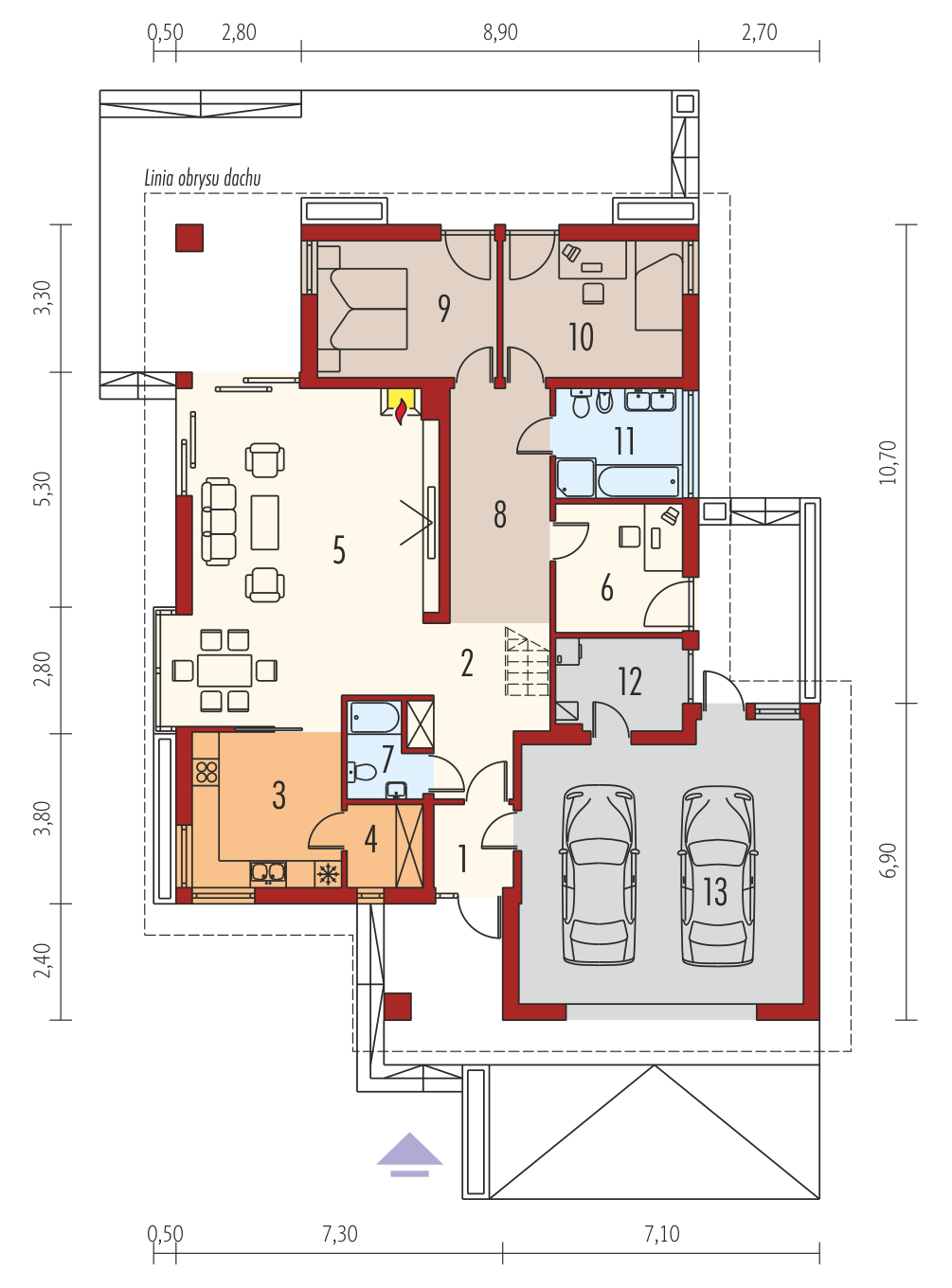 Charakterystyka: Dom parterowy z poddaszem do późniejszej adaptacji, niepodpiwniczony, z garażem dwustanowiskowymPrzeznaczenie: Dom dla 2-4-osobowej rodziny Technologia i konstrukcja:Ściany zewnętrzne: murowane, dwuwarstwowe, ceramika poryzowana 24 cm, ocieplenie wełna mineralna 12 cmStrop: gęstożebrowy TerivaDach: konstrukcja drewniana, ocieplenie wełna mineralna 30 cm, dachówka ceramiczna lub cementowa Rozwiązania instalacyjne:Ogrzewanie: kocioł gazowy kondensacyjny, rozprowadzenie ciepła: grzejnikiWentylacja: grawitacyjna Wykończenie:Elewacje: tynk cienkowarstwowy mineralny, okładzina drewnianaStolarka: drewniana, PVC lub aluminiowa, drzwi wejściowe i brama garażowa firmy HörmannWersje - zapytaj o dostępność:- Glen III – bez garażu i z garażem jednostanowiskowym- Glen – podobny układ funkcjonalny, dom parterowy, bez poddasza do adaptacji, kąt nachylania dachu 30°, różne wersje garaży- Glen II - podobny układ funkcjonalny, bez poddasza do adaptacji, kąt nachylania dachu 30°, bez garażu lub z garażem dwustanowiskowym- Glen II G1 Leca® DOM – dom w technologii Leca® KERAMZYTU- Glen II Multi-Comfort - dom z rozwiązaniami technologiczno-materiałowymi Grupy Saint-Gobain, różne wersje garaży- Glen IV – podobny układ funkcjonalny, ścianki działowe w technologii szkieletowej Rigips, prefabrykowane wiązary dachowe, bez ścian nośnych i stopu żelbetowego, różne wersje garaży- Glen V – podobny układ funkcjonalny, ściany zewnętrzne trójwarstwowe, wykończenie klinkierowe elewacji, różne wersje garaży- Odbicie lustrzane do każdej wersji Istnieje techniczna możliwość:- podpiwniczenia budynku- wykonania budynku w technologii szkieletowej