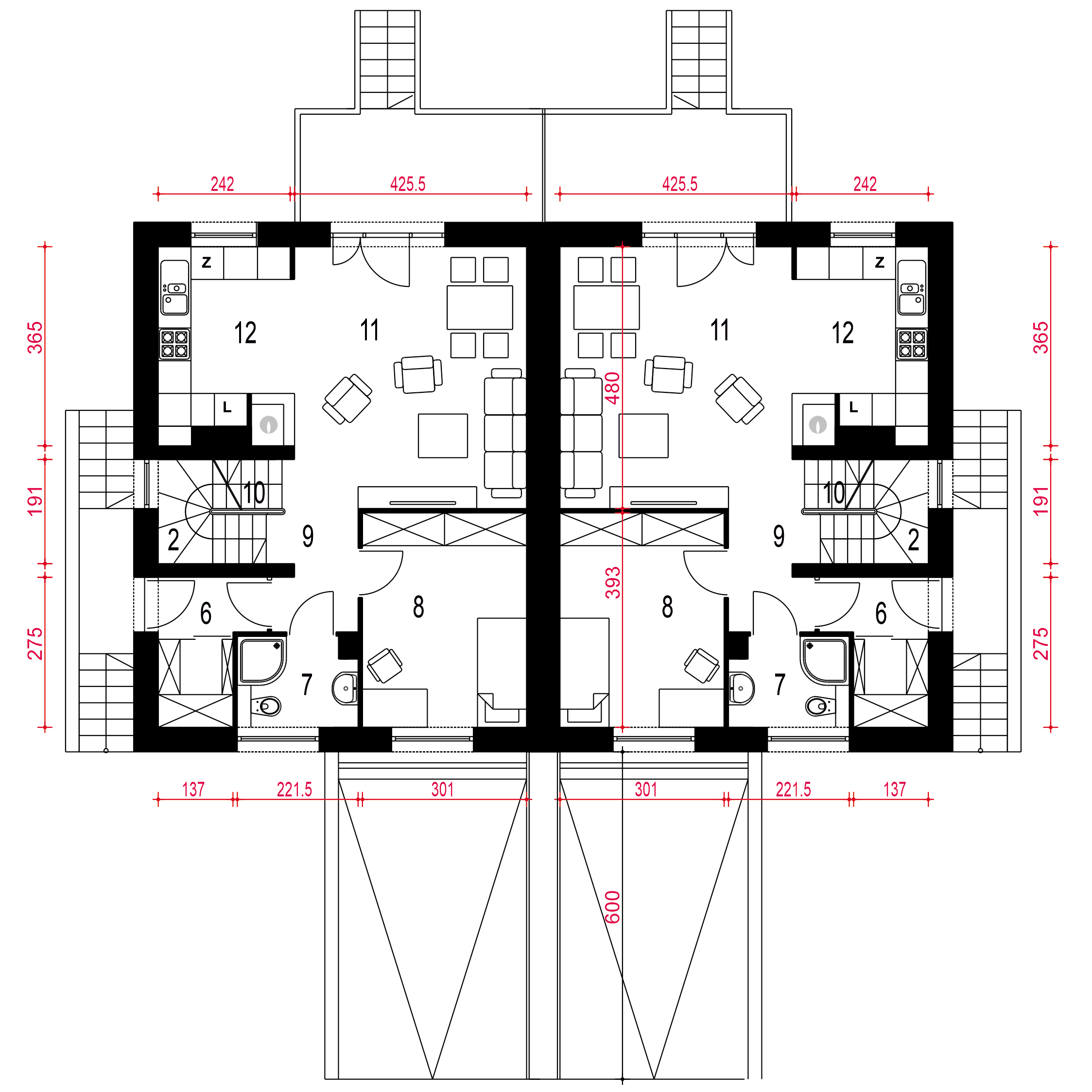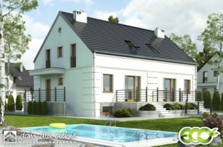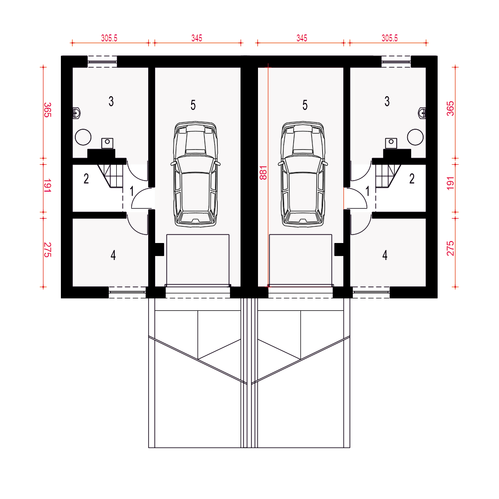 (Uwaga: projekty typu bliźniak oferujemy jako domy dwulokalowe, projekt można zamówić również w zabudowie bliźniaczej) POJEDYNCZA DOKUMENTACJE NA OBA SEGMENTY Grab w zabudowie bliźniaczej z podwójną ścianą to połączone segmenty w odbiciach lustrzanych, od strony garaży. Opis poniżej odnosi się do jednego segmentu.Grab jest propozycją niedużego domu jednorodzinnego utrzymanego w klasycznej stylistyce. Przeznaczony jest szczególnie dla wąskich działek miejskich i podmiejskich oraz do zabudowy bliźniaczej. Projekt przewiduje wbudowany garaż oraz pomieszczenia pomocnicze takie jak kotłownia oraz spiżarnia w piwnicy.Projekt przewidziano dla potrzeb 4-5 osobowej rodziny. Na parterze mamy ustawny i połączony z kuchnią i jadalnią salonu a także dodatkowy pokój, niewielką łazienkę oraz duży wiatrołap z garderobą.Na piętrze zaprojektowano trzy sypialnie oraz łazienkę. Biały kolor na elewacji zarówno w detalu jak i na płaskich powierzchniach oraz niewielki dodatek szarości podkreśla elegancki charakter budynku. Jedną z wielu zalet projektu Grab jest maksymalnie uproszczona konstrukcja oraz prosta bryła, co powoduje, że Grab będzie domem tanim w budowie i eksploatacji.