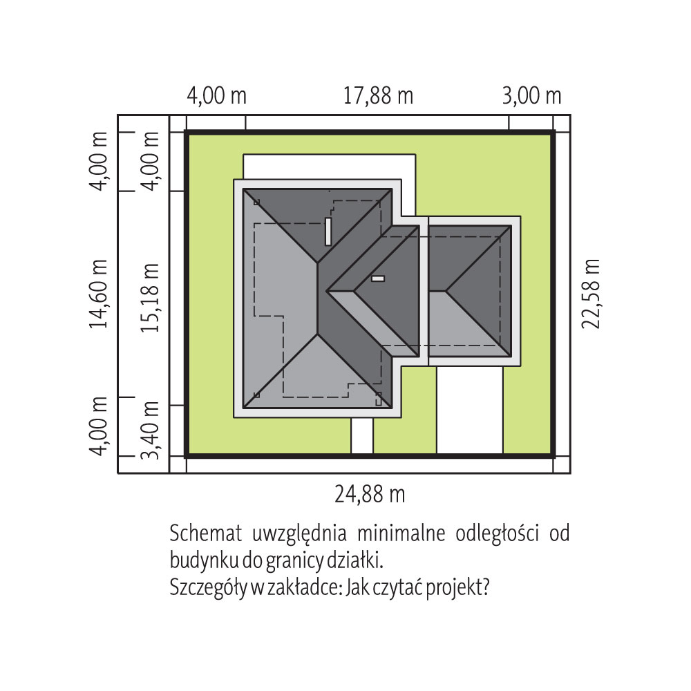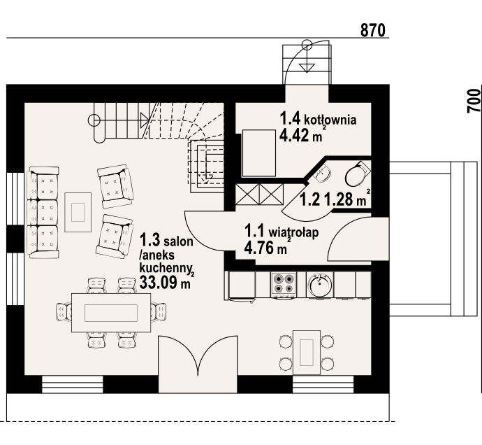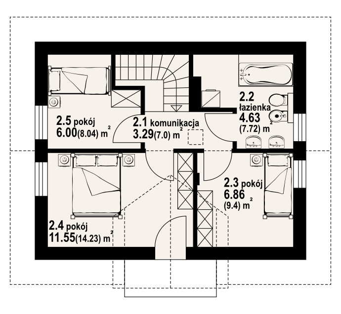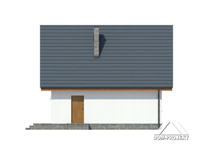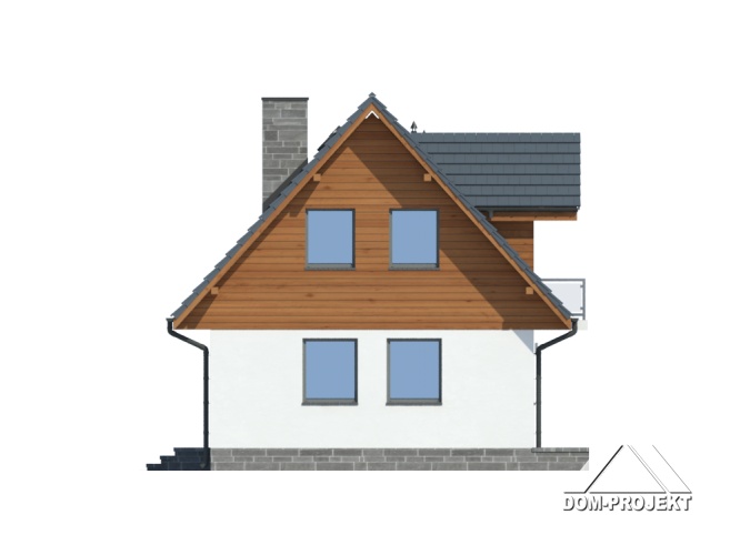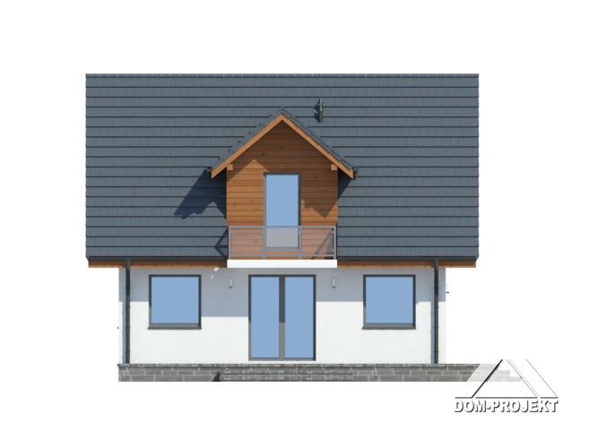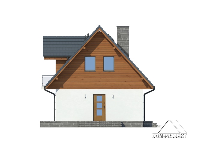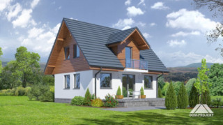 Nieduży ale wygodny dom jednorodzinny. Duży salon z aneksem kuchennym, kominkiem, schodami na poddasze i wyjściem na taras. Wiatrołap i kotłownia (na gaz lub paliwa stałe). Na poddaszu trzy pokoje, łazienka i komunikacja. Największy pokój poddasza ma balkon.