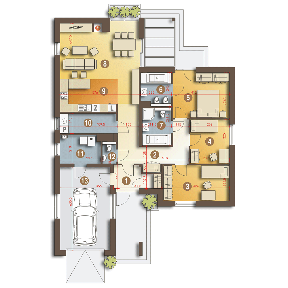 Projekt domu Gracjan. To praktyczny, nowoczesny, jednorodzinny dom parterowy z garażem jednostanowiskowym. Gracjan to popularny dom w typu bungalow. Funkcjonalne wnętrze z wygospodarowaną przestrzenią na wygodną część gospodarczą, kotłownię na paliwo stałe, miejsce na garderobę - zlokalizowaną w wiatrołapie oraz szafę wnękową w holu. Rozkład pomieszczeń pozwolił wydzielić przestrzeń prywatną, która obejmuje: trzy sypialnie i dwie łazienki. W części ogólnodostępnej projektu mamy otwartą kuchnię oraz salon z kominkiem i z jadalnią. Dodatkowo przewidziano wydzieloną tu toaletę.fundamenty: BETONOWE ściany zewnętrzne: POROTHERM+STYROPIAN TERMO ORGANIKA rodzaj stropu i konstrukcja dachu: TERIVA, tradycyjna więźba dachowa elewacje: TYNK STRUKTURALNY pokrycie dachu: DACHÓWKA CEM. lub CER.