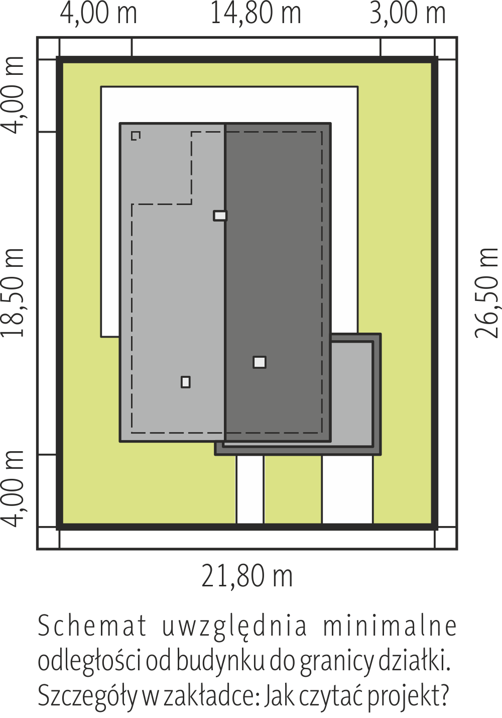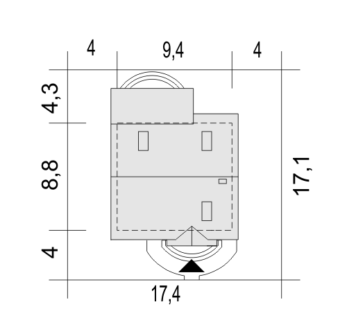 Budynek mieszkalny, jednorodzinny, parterowy przeznaczony dla 3-osobowej rodziny. Na parterze zaprojektowano dwie sypialnie, dwie łazienki, kotłownię, spiżarnię, kuchnię oraz pokój dzienny z jadalnią. Z pokoju dziennego mamy wyjście na przestronny, częściowo zadaszony taras.Ściany: 2-warstwowe - pustak ceramiczny + styropian, Stropy: żelbetowe, wylewane, Dach: dachówka ceramiczna, kąt nachylenia 30°