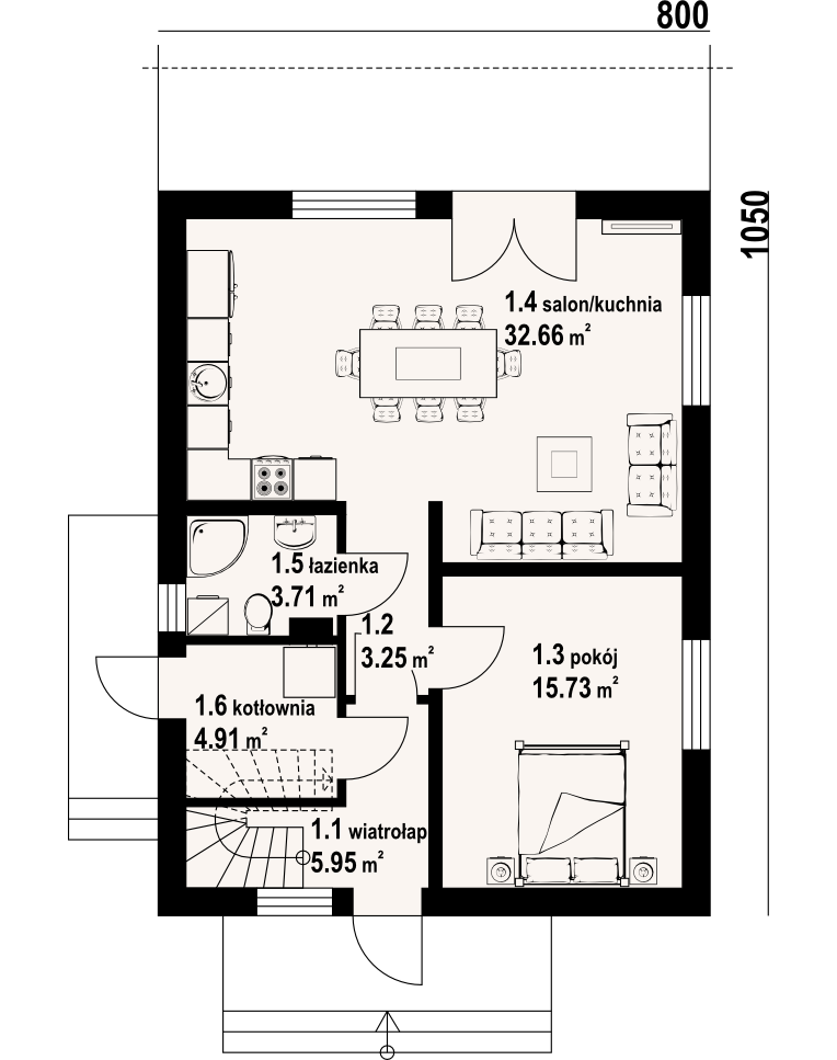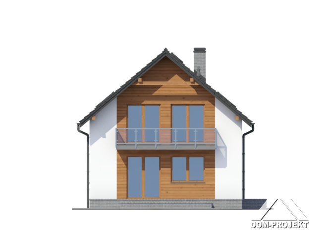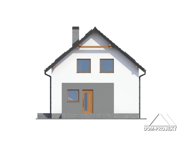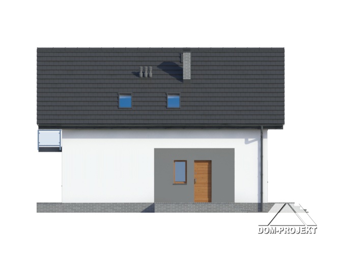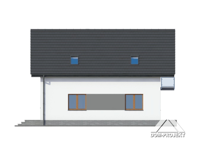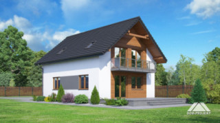 Dom na wąską działkę. Duży salon z aneksem kuchennym i wyjściem na taras. Pokój, łazienka, korytarz, kotłownia i wiatrołap. Na poddaszu trzy pokoje, łazienka, komunikacja i balkon. Zwarta bryła budynki i dach dwuspadowy sprzyjają szybkiej i taniej budowie i niskim kosztom eksploatacji.