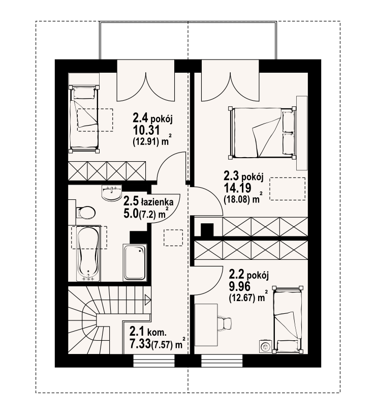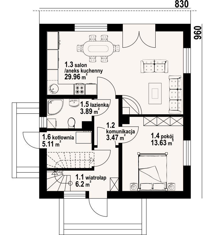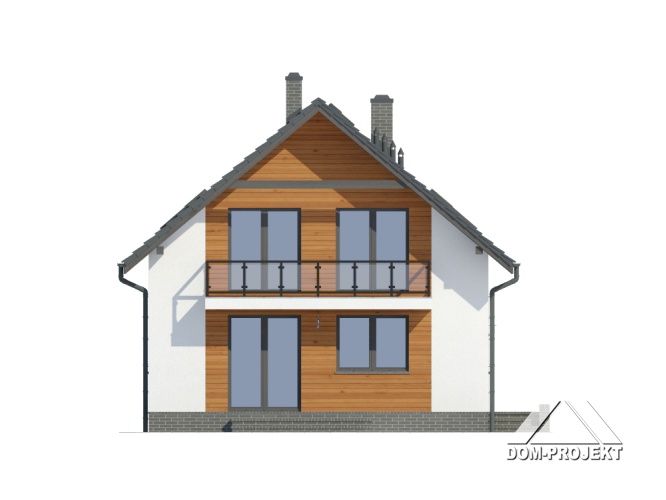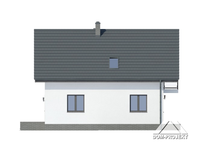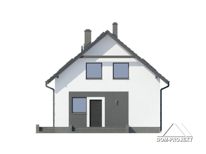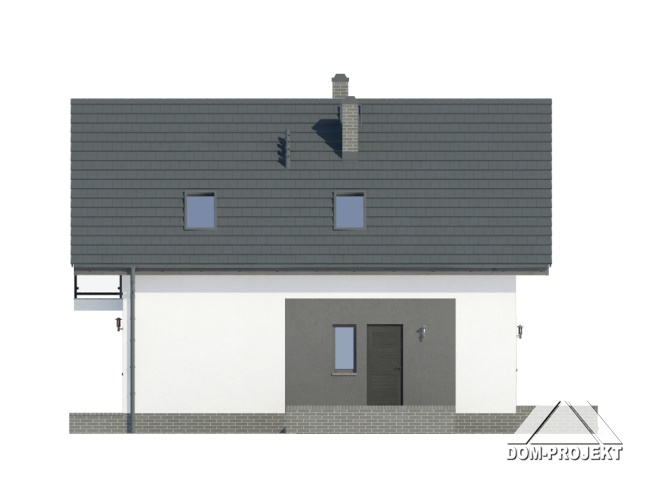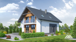 Dom dla 4-6 osobowej rodziny. parterze wygodny salon z aneksem kuchennym, kominkiem i wyjściem na taras, pokój. łazienka, kotłownia, wiatrołap i komunikacja. Na poddaszu trzy pokoje, łazienka i komunikacja. Zwarta bryła budynku i dach dwuspadowy umożliwiają szybką i tanią realizację i niskie koszty eksploatacji.