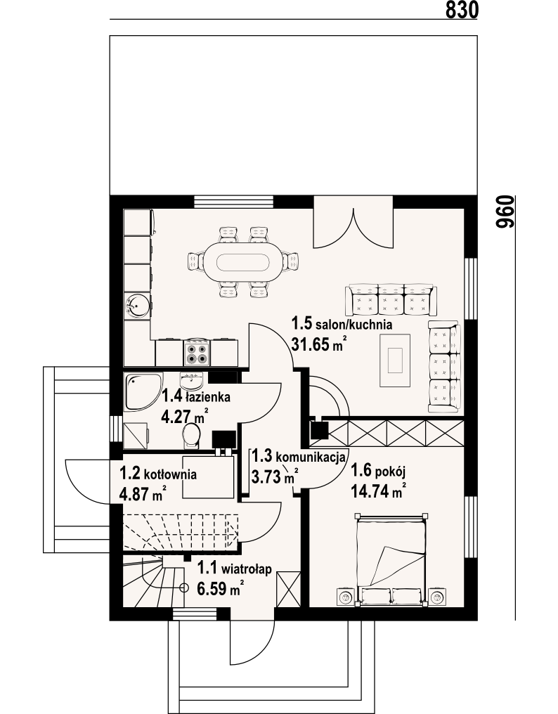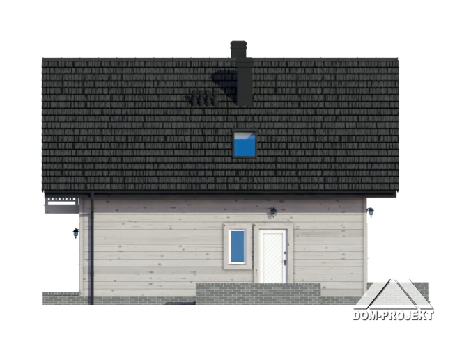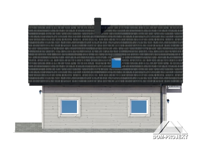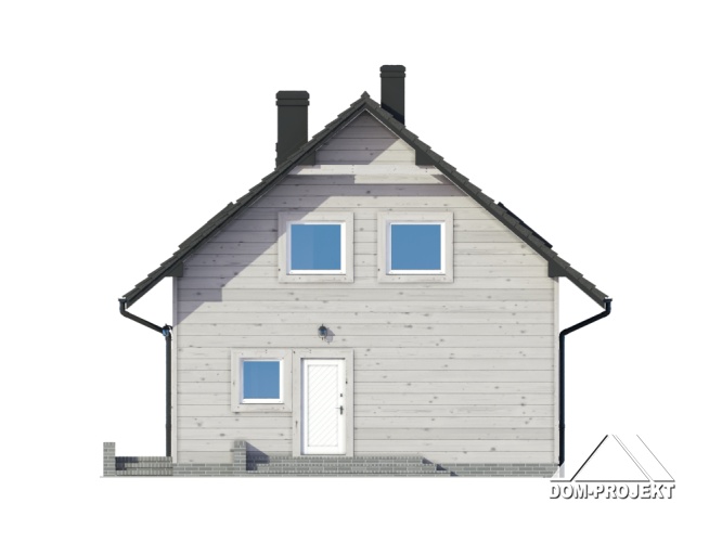 Dom w konstrukcji szkieletu drewnianego. Duży salon z aneksem kuchennym, kominkiem i wyjściem na taras. Pokój, łazienka, kotłownia, wiatrołap. Na poddaszu trzy pokoje, łazienka, komunikacja i balkon.Zwarta bryła budynku i dach dwuspadowy sprzyjają szybkiej i taniej budowie i niskim kosztom eksploatacji.