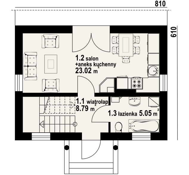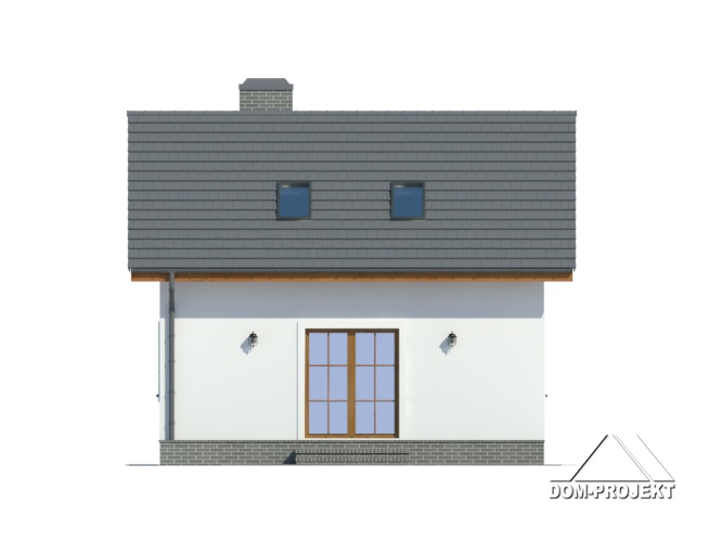Mały domek z poddaszem użytkowym. Salon z aneksem kuchennym i łazienką to pomieszczenia na parterze. Na poddaszu duże pokoje (sypialnie) i łazienka. Zwarta bryła i jeden komin zapewnia niskie koszty budowy i eksploatacji.