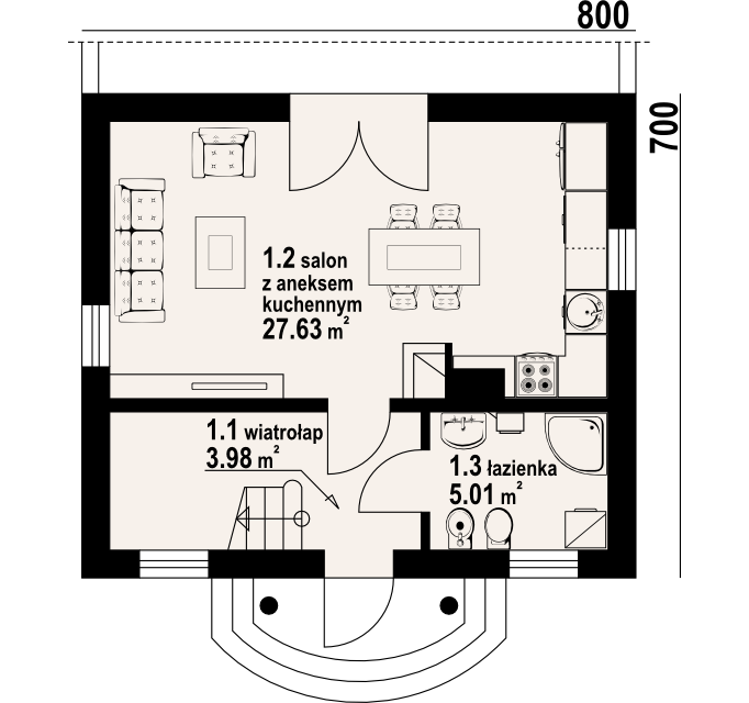 Na planie parteru dominuje pokój dzienny połączony z aneksem kuchennym. W wielofunkcyjnym pomieszczeniu zrezygnowano ze ścian działowych, dodając mu w ten sposób przestronności. Wrażenie zrobią także przeszklone drzwi prowadz