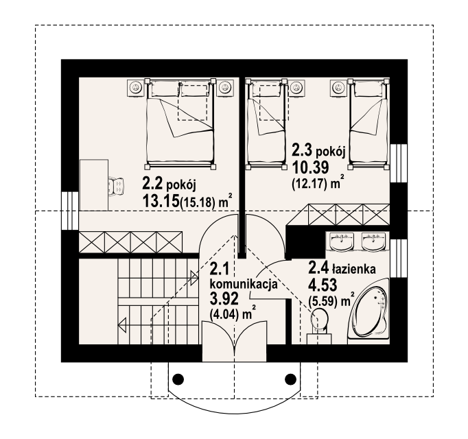 Gotowy projekt domu Gródek 5 to przykład niewielkiej, ale funkcjonalnej przestrzeni, na którą może pozwolić sobie prawie każdy. Niewielki wymiar działki budowlanej czy ograniczony budżet nie muszą być przeszkodą w powstaniu domu dla trzyosobowej rodziny. Powierzchnia użytkowa wynosząca 68,61 m2 pozwoliła wygospodarować łącznie trzy pokoje i dwie łazienki. Rozdzielenie pomieszczeń pomiędzy dwie kondygnacji sprzyja wydzieleniu stref - dziennej i sypialnej, co pozostaje najczęstszym rozwiązaniem proponowanym przez architektów.