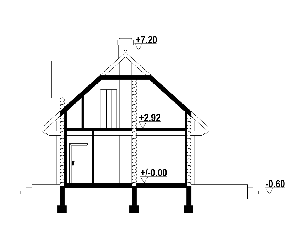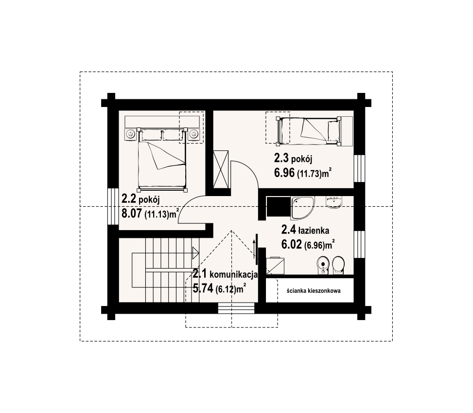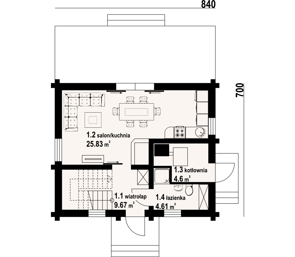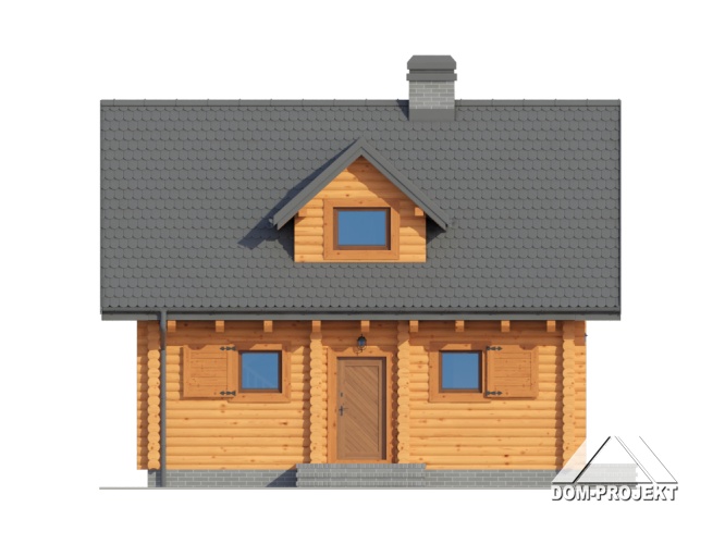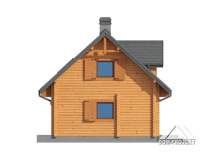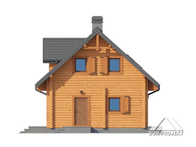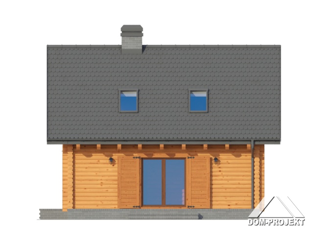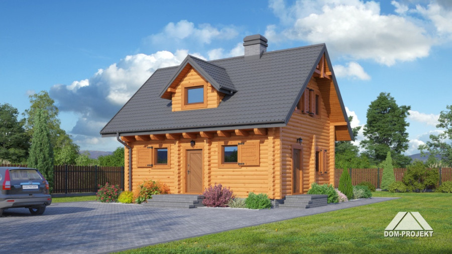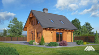Mały dom z bali drewnianych. Duży salon z aneksem kuchennym, kominkiem i wyjściem na taras. Łazienka, kotłownia, wiatrołap i schody na poddasze. Na poddaszu dwa pokoje, łazienka i komunikacja. Prosta bryła budynku i dach dwuspadowy sprzyjają szybkiej i taniej budowie i niskim kosztom eksploatacji.
