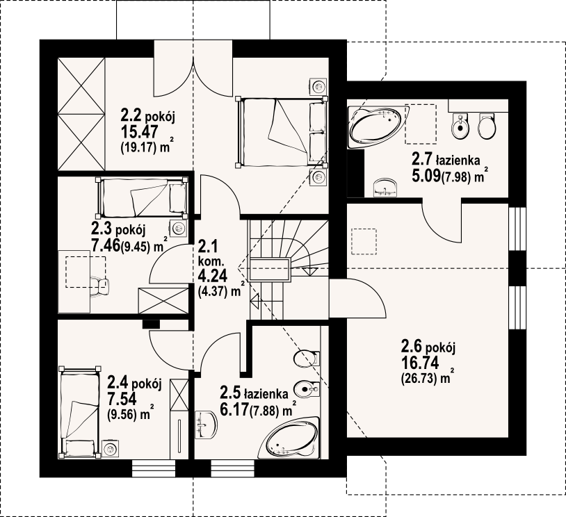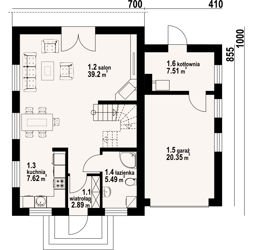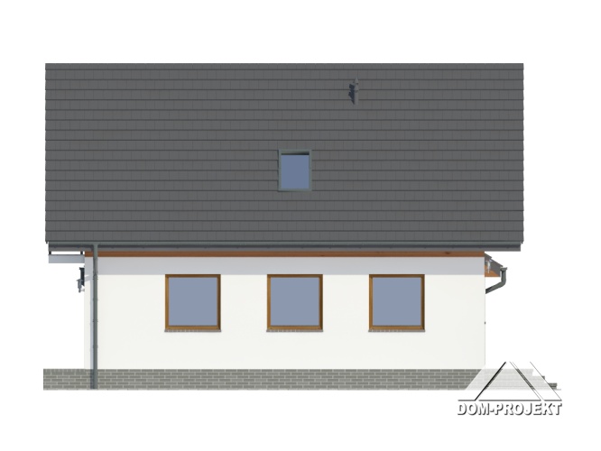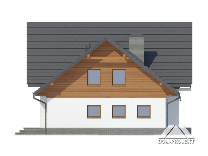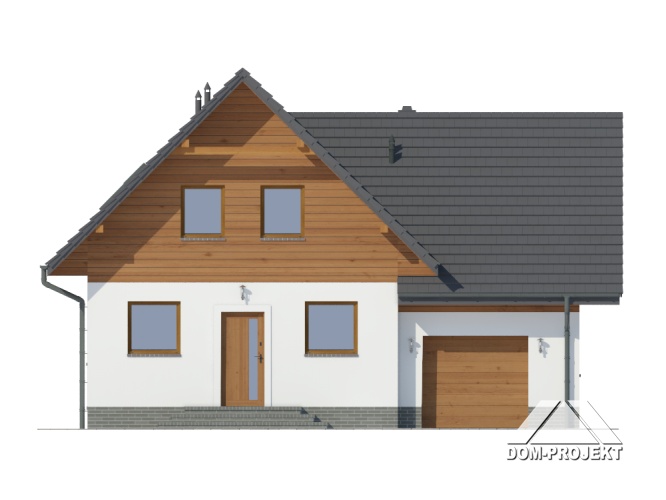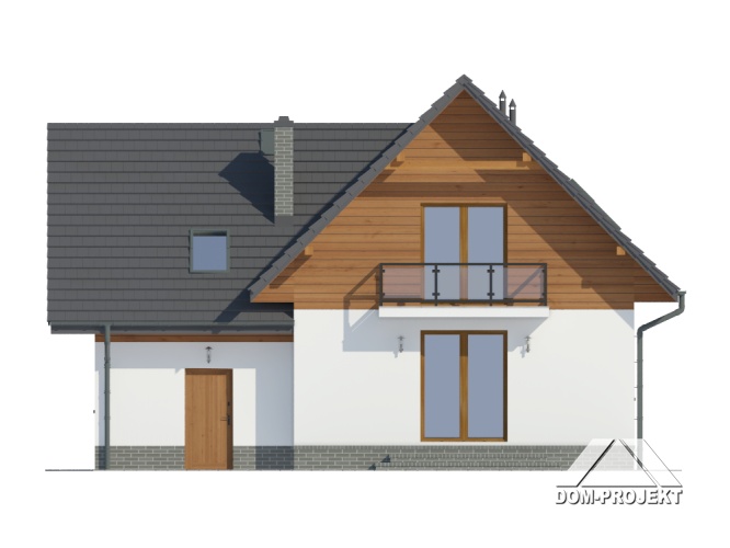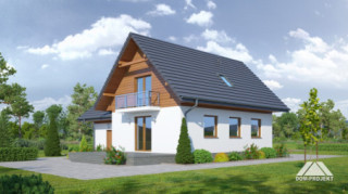 Dom z poddaszem mieszkalnym, garażem i kotłownią. Duży salon z aneksem kuchennym, kominkiem, wyjściem na taras i schodami na poddasze. Łazienka, wiatrołap, garaż i kotłownia. Na poddaszu cztery pokoje, dwie łazienki, komunikacja, balkon. Zwarta bryła budynku sprzyja szybkiej i taniej budowie i niskim kosztom eksploatacji.