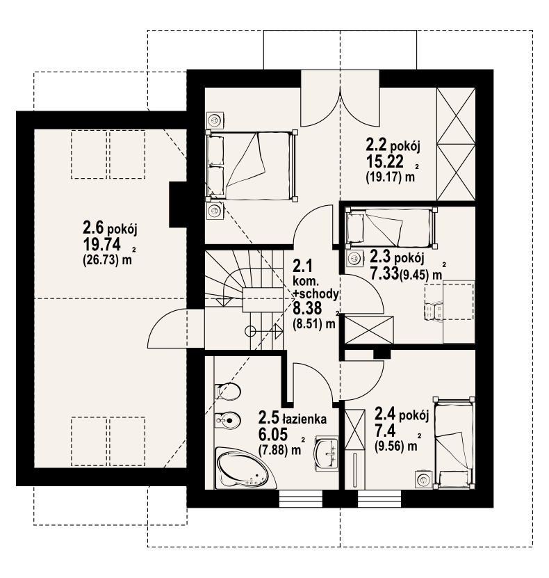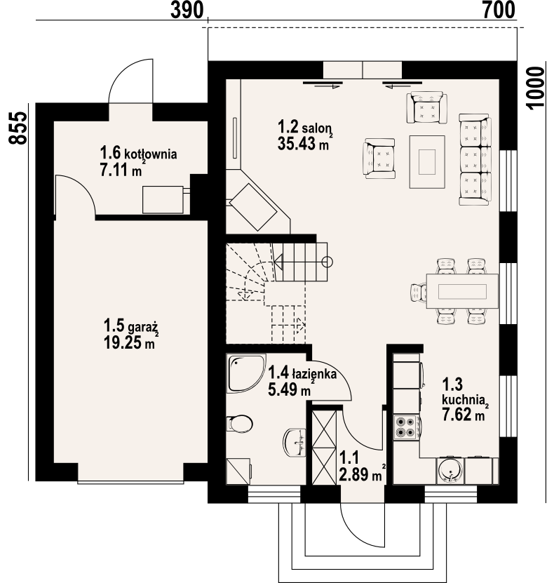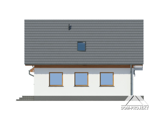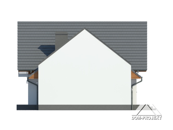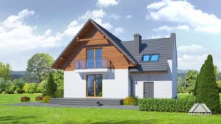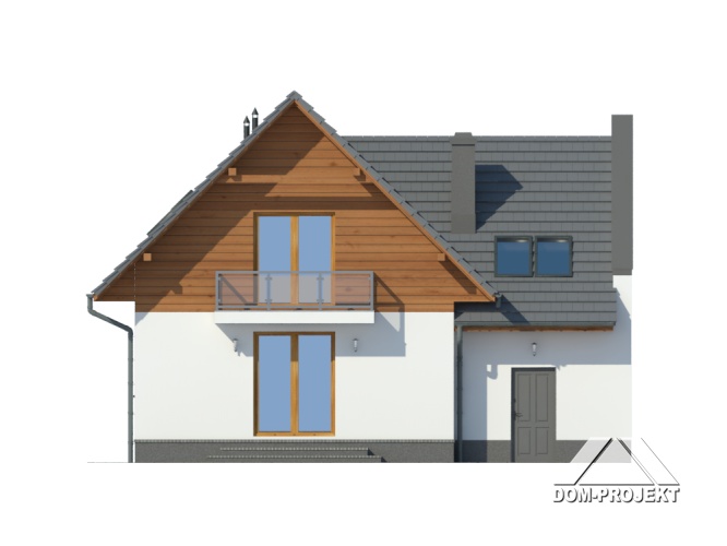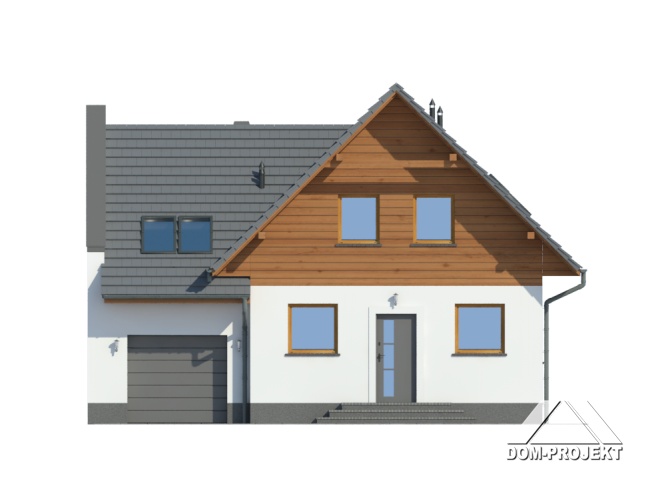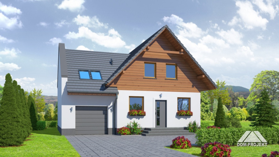 Dom z poddaszem mieszkalnym i garażem. Duży salon z aneksem kuchennym, kominkiem, wyjściem na taras i schodami na poddasze. Łazienka, wiatrołap, garaż i kotłownia. Na poddaszu cztery pokoje, łazienka, komunikacja, balkon. Ściana szczytowa umożliwia budowę w granicy lub w bliskiej odległości od granicy. Zwarta bryła budynku sprzyja szybkiej i taniej budowie i niskim kosztom eksploatacji.