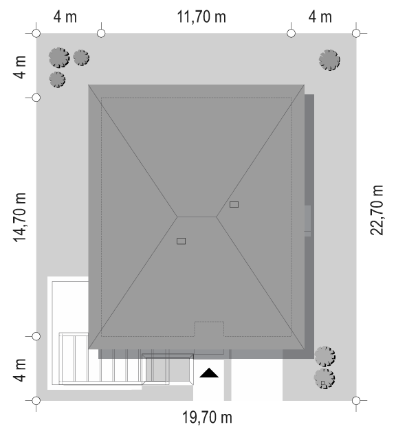 Na parterze wejście z małego wiatrołapu, duży pokój dzienny z kominkiem połączony z funkcjonalną kuchnią oraz mała toaleta z prysznicem. Na poddaszu z niewielkiego przedpokoju wejścia do dwóch sypialni i wygodnej łazienki. Nieduży funkcjonalny dom z rzutem opartym na kwadracie. Idealny jako całoroczny dla rodziny 3 osobowej, albo jako domek letniskowy. Prostą bryłę przykrywa dwuspadowy dach o kącie nachylenia połaci 40°.