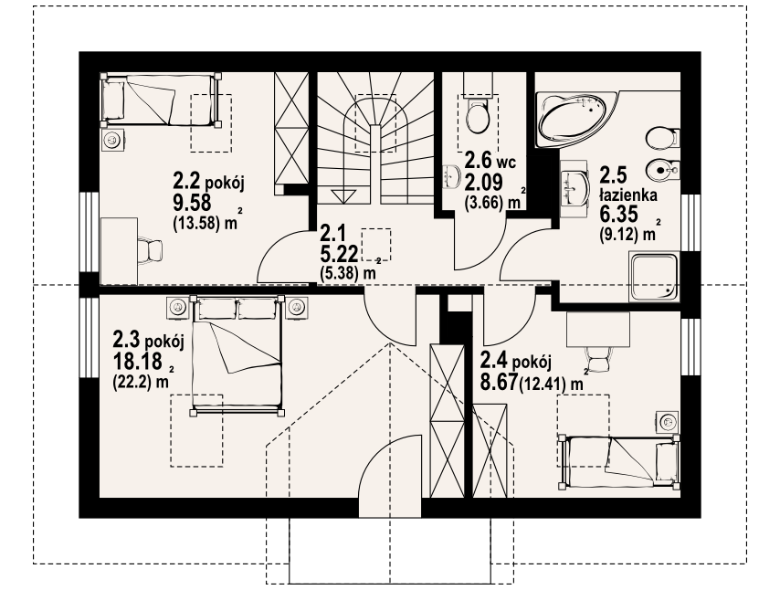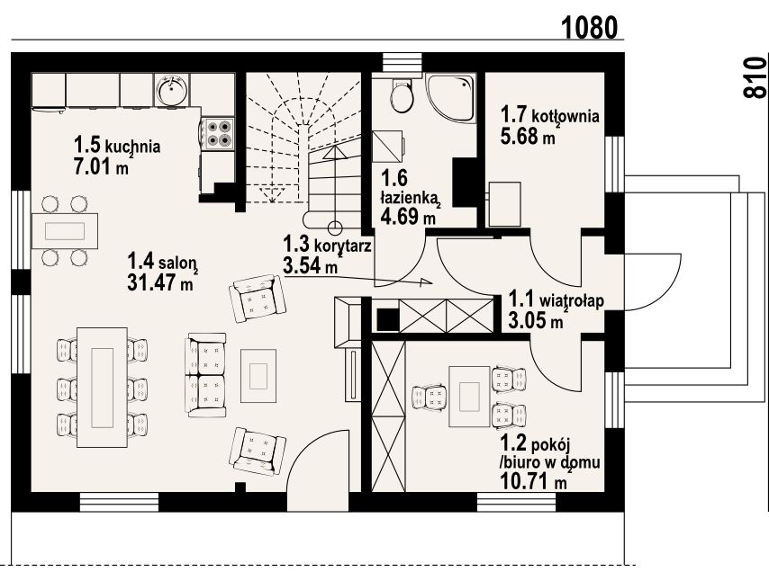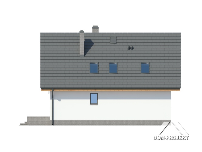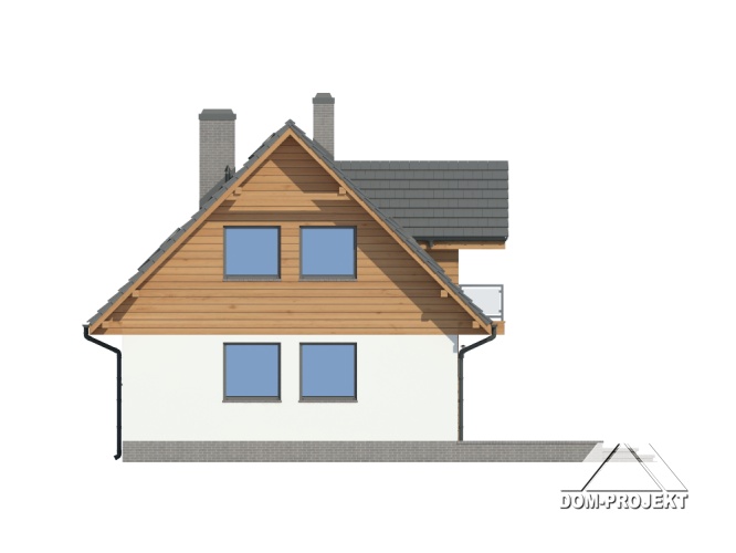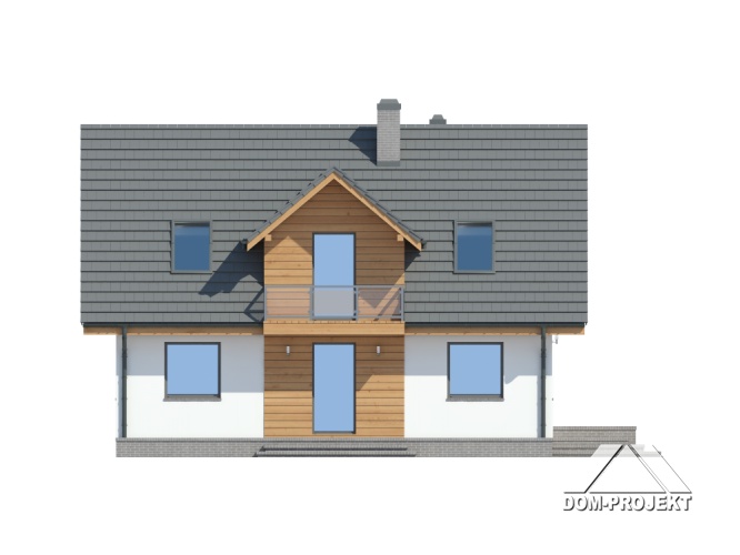 Dom w konstrukcji szkieletu drewniane dla czteroosobowej rodziny. Duży salon z aneksem kuchennym, kominkiem, schodami na poddasze i wyjściem na taras. Pokój do pracy (biuro w domu), łazienka, kotłownia, wiatrołap i komunikacja. Na poddaszu trzy pokoje, łazienka, wc i komunikacja. Największy pokój poddasza ma balkon. Zwarta bryła budynku, dach dwuspadowy.