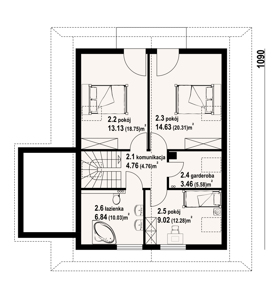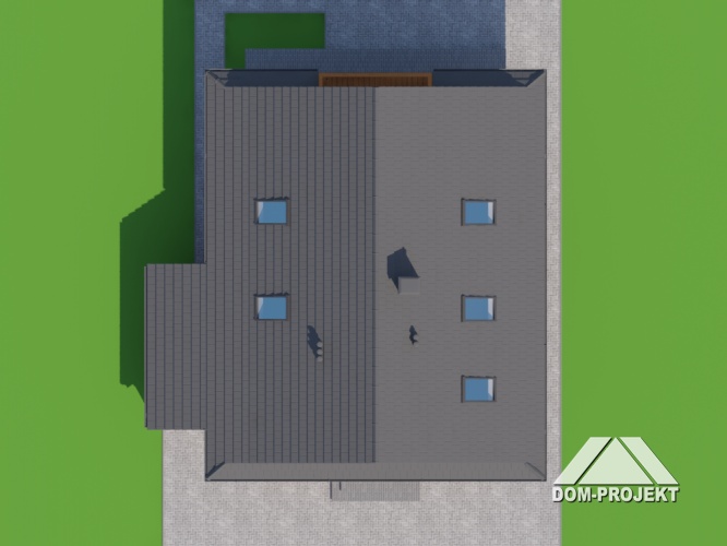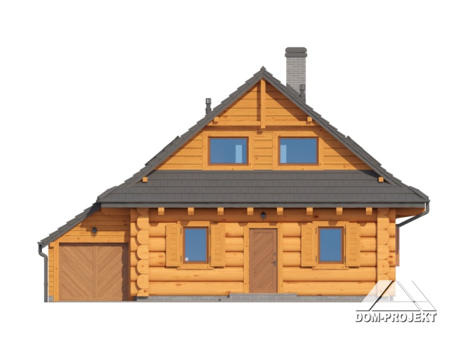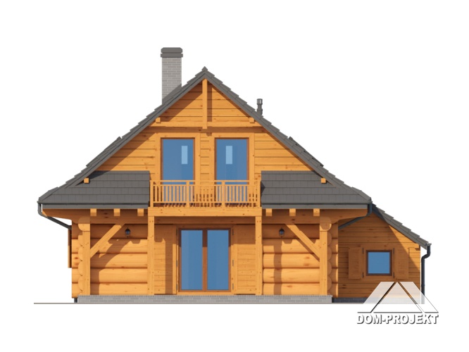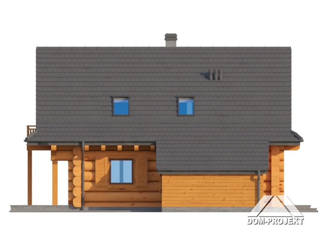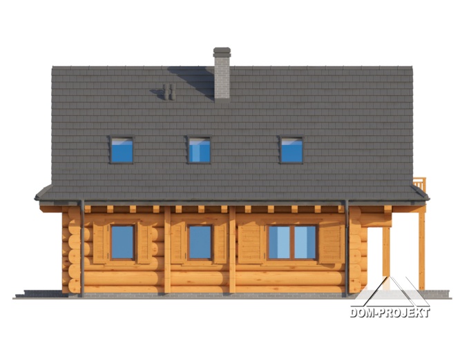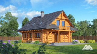 Dom z bali drewnianych. Duży salon z aneksem kuchennym, kominkiem i wyjściem na częściowo zadaszony taras. Pokój, łazienka, pralnia, wiatrołap i komunikacja. Pomieszczenie gospodarcze. Na poddaszu trzy pokoje, łazienka, garderoba, balkon i komunikacja. Zwarta bryła budynku i dach dwuspadowy sprzyjają szybkiej i taniej budowie i niskim kosztom eksploatacji.