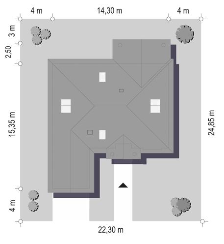 Dom z użytkowym poddaszem, przeznaczony dla 4-6-osobowej rodziny. Na parterze znajduje się pokój dzienny z bezpośrednim wyjściem do ogrodu, przestrzennie połączony z jadalnią i kuchnią, łazienka, gabinet, pomieszczenie gospodarcze oraz garaż z osobnym wejściem. Na poddaszu znajdują się trzy pokoje, łazienka z pralnią oraz garderoba. Centralnie usytuowany kominek pozwala na wykonanie ogrzewania kominkowego. Projekt dostępny w wersji bez garażu – Gwiazdka III oraz z garażem dwustanowiskowym - Gwiazdka II. Projekt może być wykorzystany do zabudowy bliźniaczej.