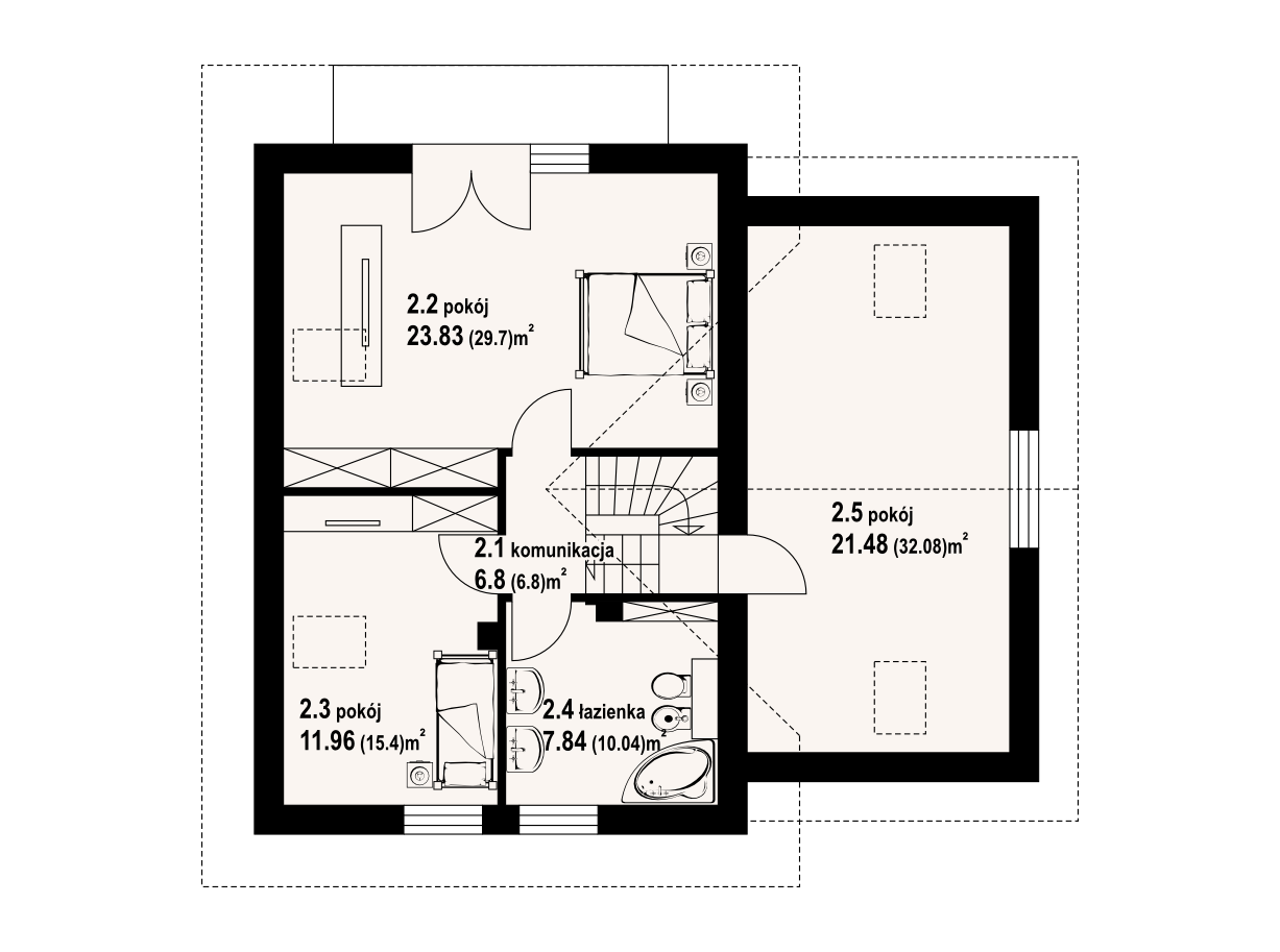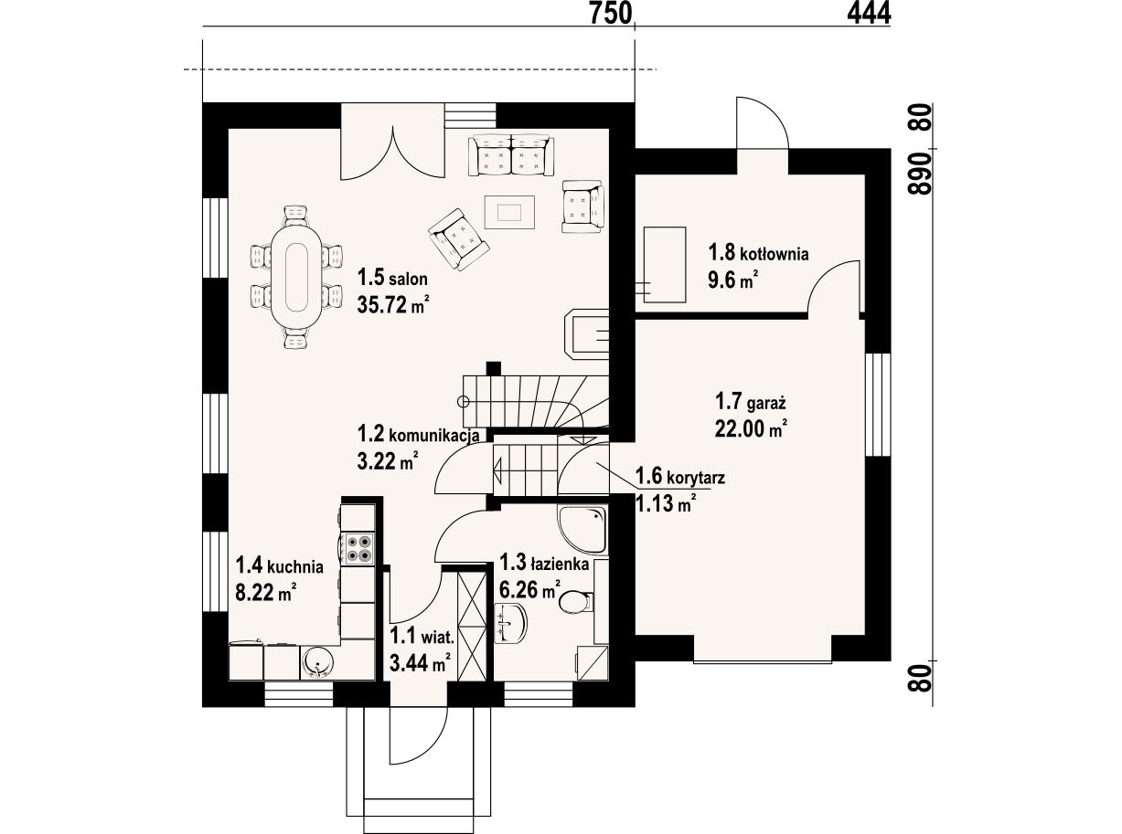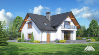 Dom z poddaszem użytkowym. Duży salon z aneksem kuchennym, kominkiem, schodami na poddasze i wyjściem na taras. Łazienka, wiatrołap, komunikacja, garaż i kotłownia. Na poddaszu trzy pokoje, łazienka, komunikacja i balkon. Zwarta bryła budynku sprzyjaj szybkiej i taniej budowie i niskim kosztom eksploatacji.
