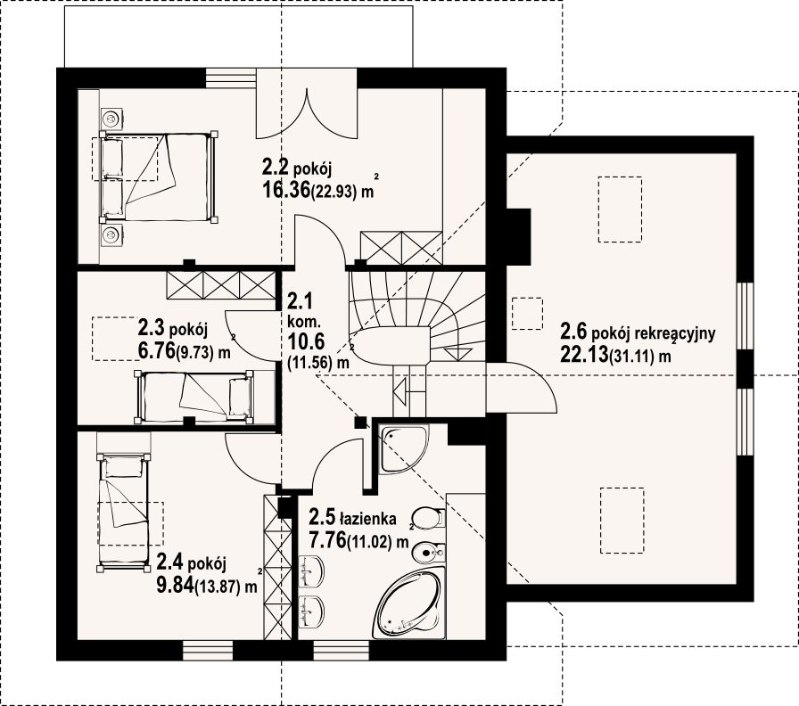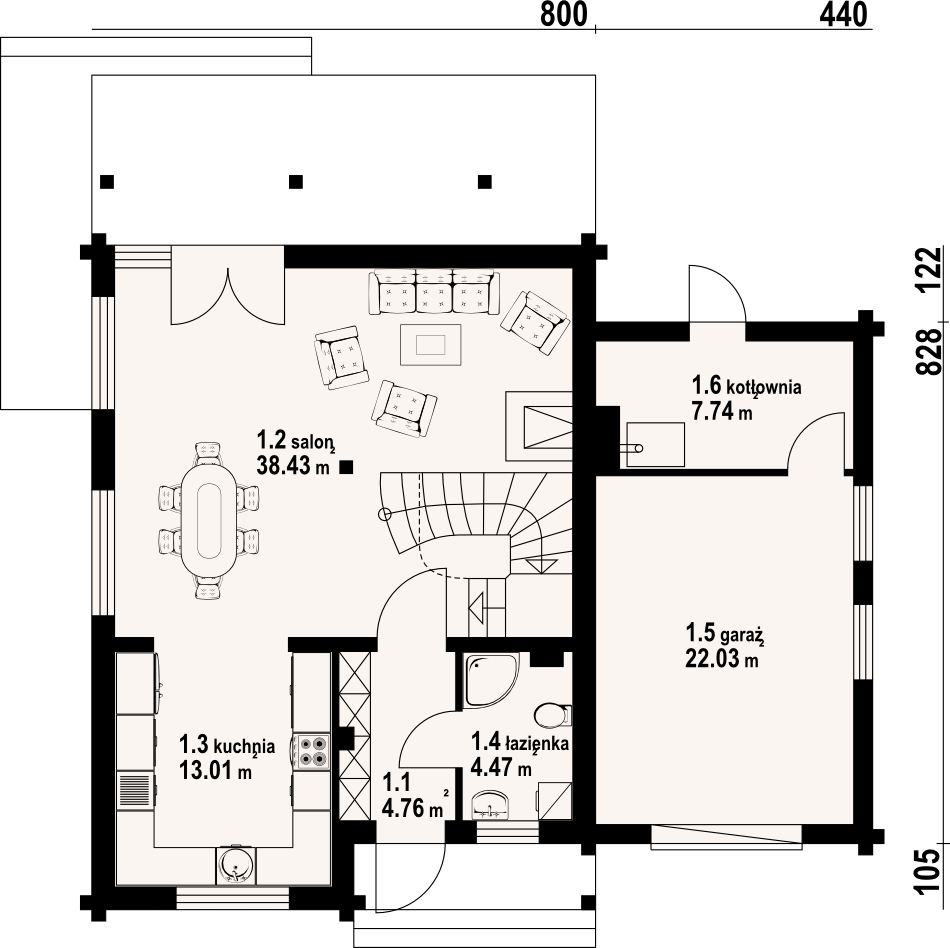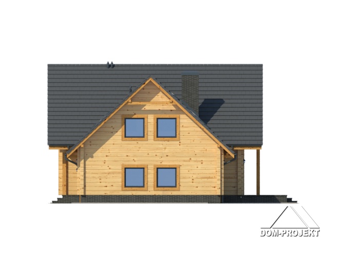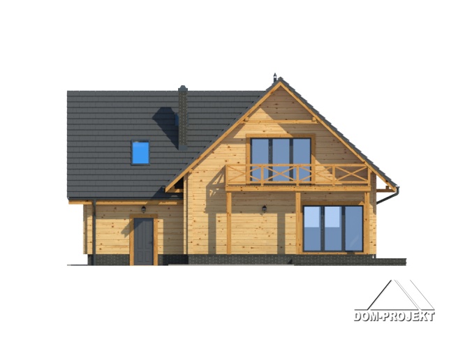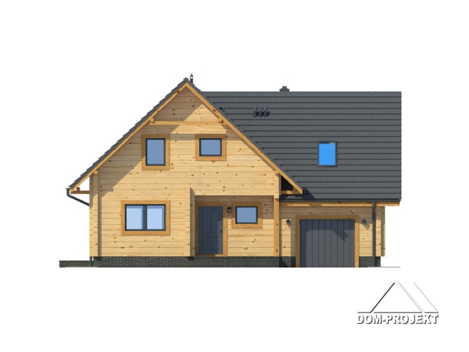 Funkcjonalny dom z użytkowym poddaszem. Na parterze duży salon z kominkiem, połączony z kuchnią. Schody z salonu prowadzą na poddasze, gdzie znajdują się trzy sypialnie, pokój rekreacyjny i łazienka. Dobudowana cześć gospodarcza mieści garaż i kotłownię.